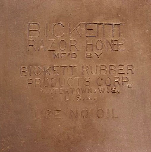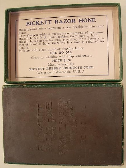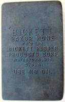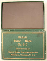 The Bickett Razor Hone No 6 C is stamped on the green box with separate set of Bickett, Watertown, Wisconsin, instructions. The 3 inch x 1/2 inch x 2 inch hone is in excellent condition and is embossed "Sunset Ebony Dry Hone" on the side of the hone.