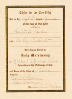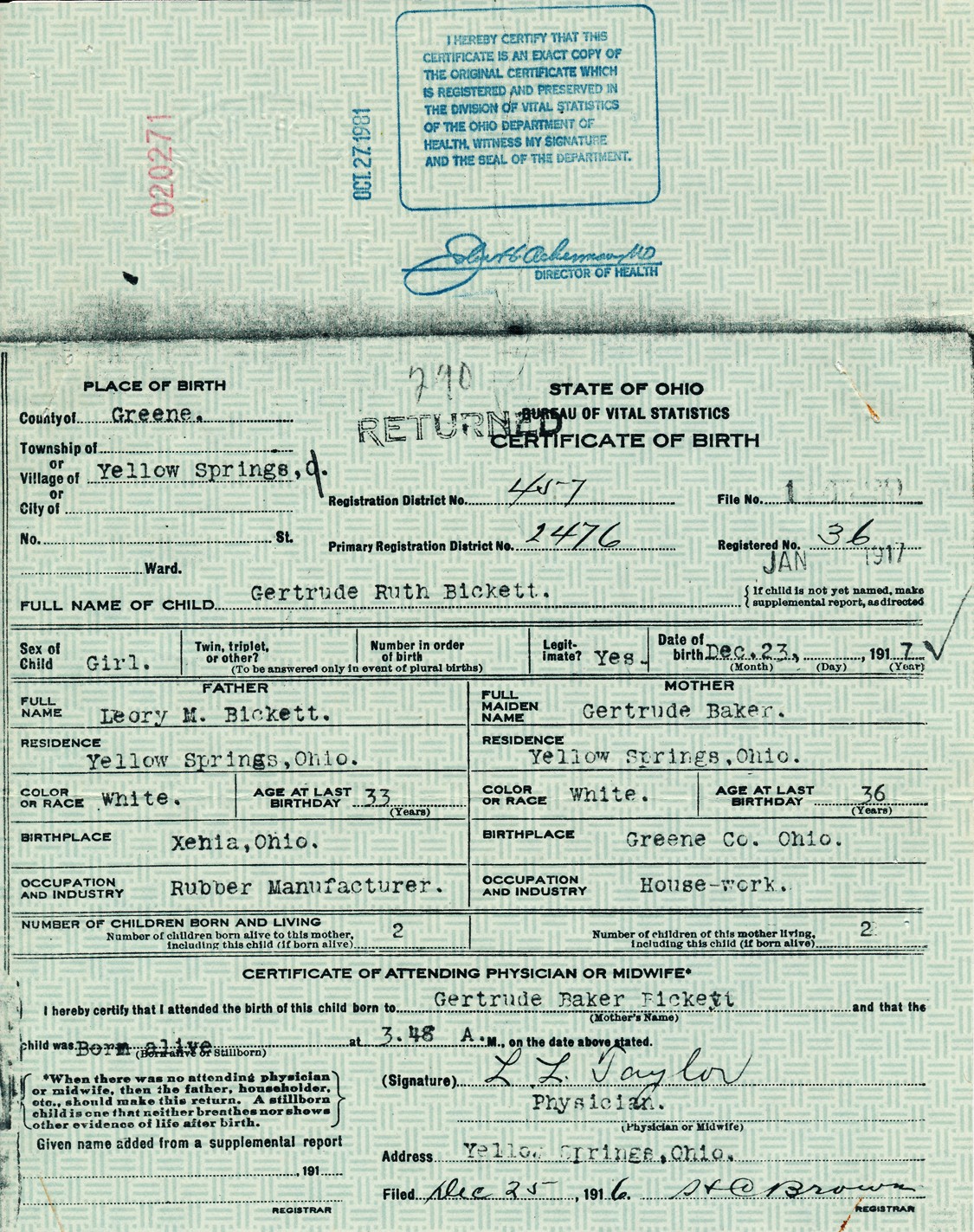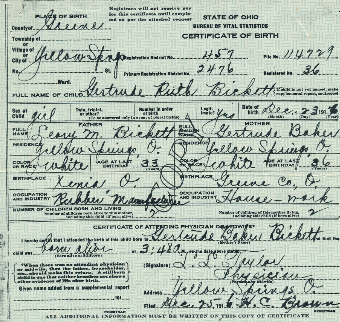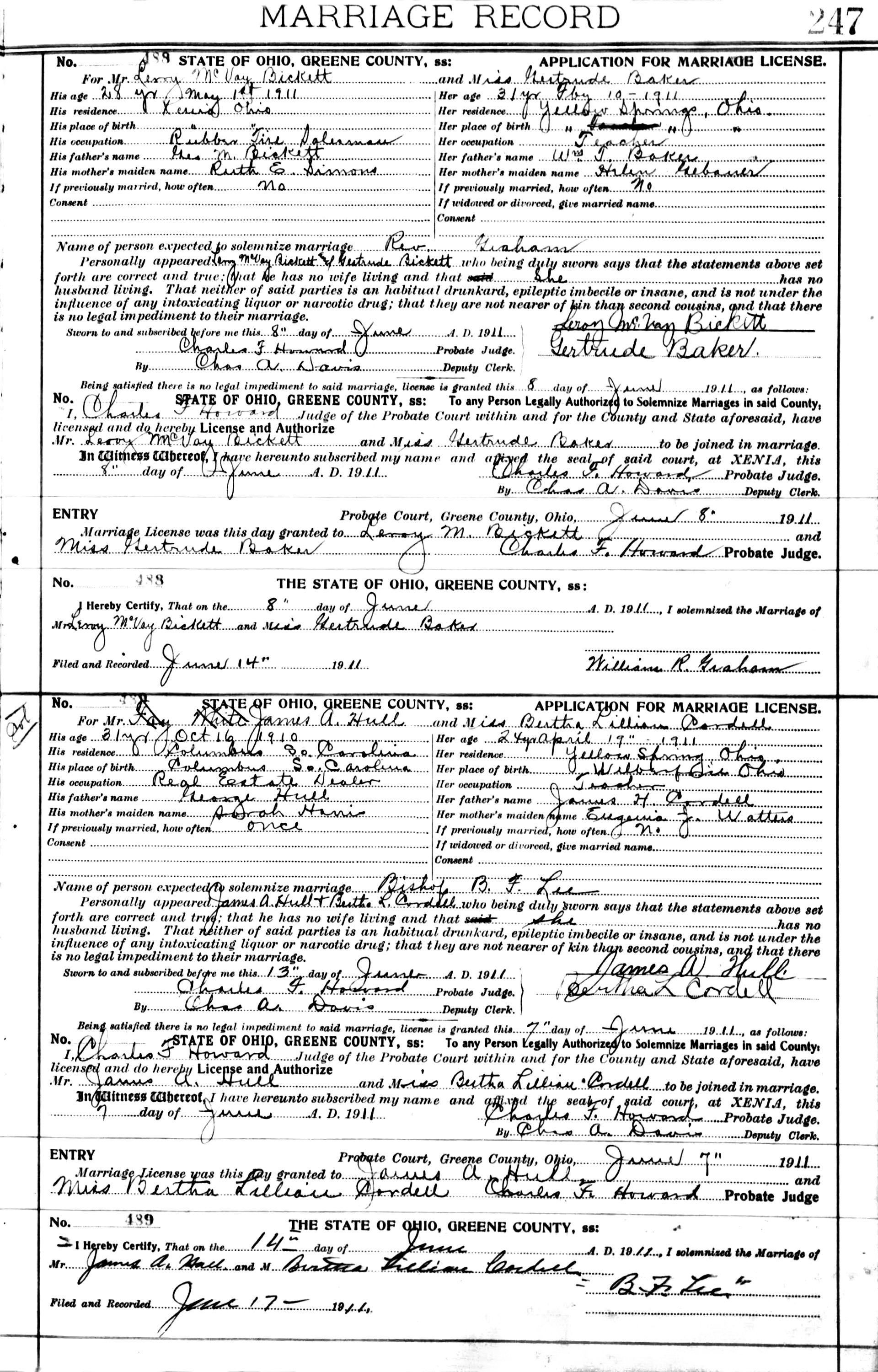 LeRoy McVey "Roy" Bickett (age 28), a bachelor, and Gertrude Pearl Patricia "Gertie" Baker (age 31), a maiden, were married June 8, 1911, in the Village of Yellow Springs, Miami Twp., Greene Co., OH.