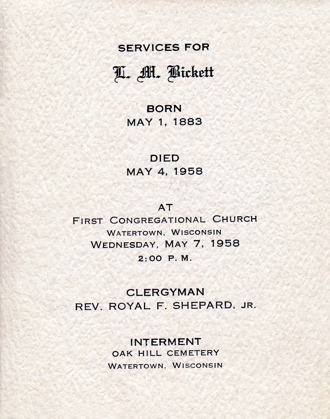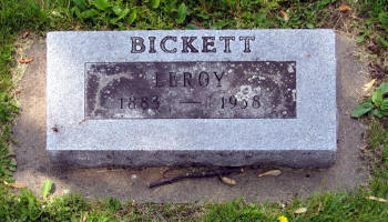 LeRoy McVey "Roy" Bickett is buried in the Bickett/Fiegel plot, Grave 9, Lot 6, Block 32, Oak Hill Cemetery, Watertown, Jefferson Co., WI.