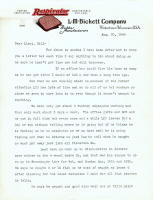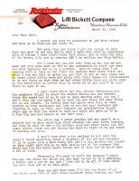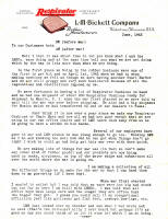 In 1942, and continuing up through 1946, additional buildings were constructed and additional equipment was installed - all from profits resulting from operations, and as the result the plant is now completely equipped to an even greater extent than it was before the transfer to Anderson, Ind. Since 1932, after the reorganization and with a starting working capital of less than $3,000, the L. M. Bickett Company has transacted up to December, 1953, a grand total of $3,188,965 of business. Earnings have been sufficient to pay dividends to all stock�holders, and the company has an established trade extending from coast to coast with approximately 3,000 customers located in practically every large city in the United States. Unfortunately, the foreign business which had been created during the years 1935 to 1941 has been wiped out due to restrictions in the various foreign countries which prohibit the importation of non-essential products, the difference in exchange resulting from World War II and economic conditions which still prevail in a great many of these countries. Operating as the Bickett Rubber Products Corp. from 1921 to 1931 and as the L. M. Bickett Company from 1932 up to date, the company has never had an idle period and continuous operation has been the rule. It might be stated that this situation is because of the diversified nature of the products manufactured, also the possibility of adding additional lines whenever any particular line indicates a slack period. Within six years after the organization of the L. M. Bickett Company all the obligations which had been assumed in the separation from the Indiana corporation had been paid, the Falk Corporation loan was repaid and occasionally new equipment is installed which automatically increases our production. Acknowledgment is made by Mr. Bickett to the original stock�holders and incorporators of the Bickett Rubber Products Corp. for their assistance in creating a new industry in Watertown, which because of the fact that it was one hundred per cent locally owned has been a contributing factor to the industrial prosperity of Watertown for the past 33 years.