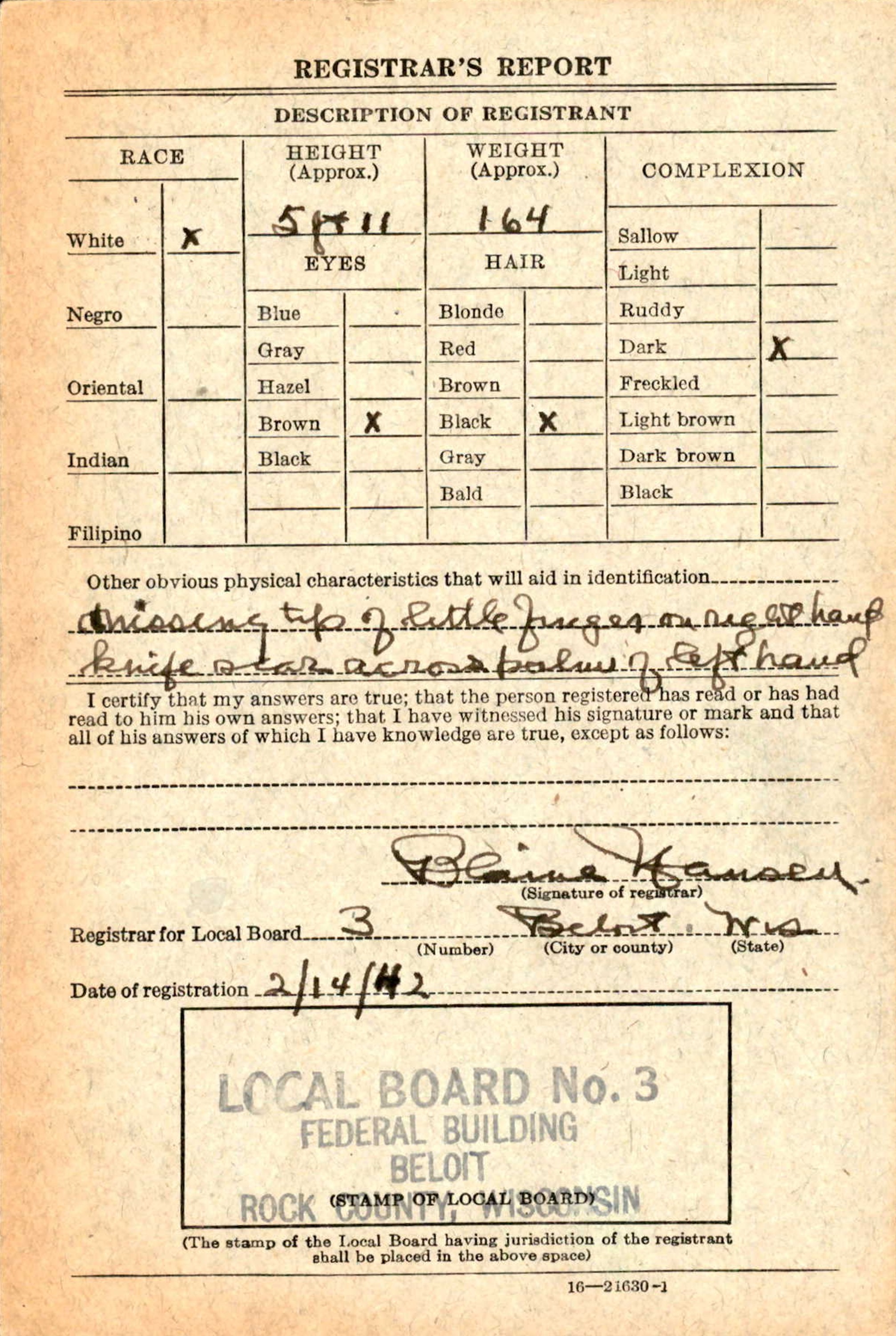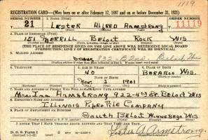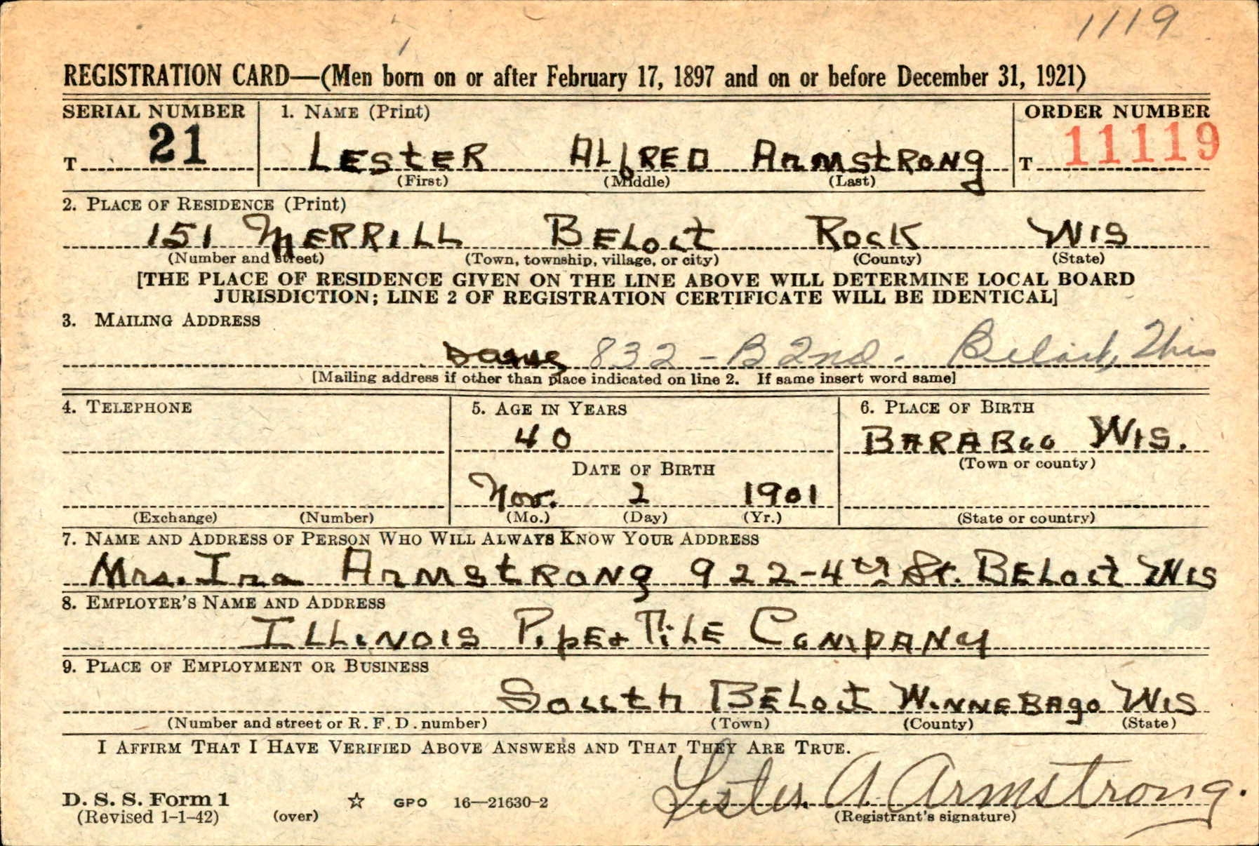 The WWII Draft Registration Report dated February 14, 1942, shows Lester Alfred Armstrong, age 40, born November 2, 1901, in Baraboo, Sauk Co., WI, is living at 151 Merrill, Beloit, Rock Co., WI employed by Illinois Pipe & Tile Co., South Beloit.