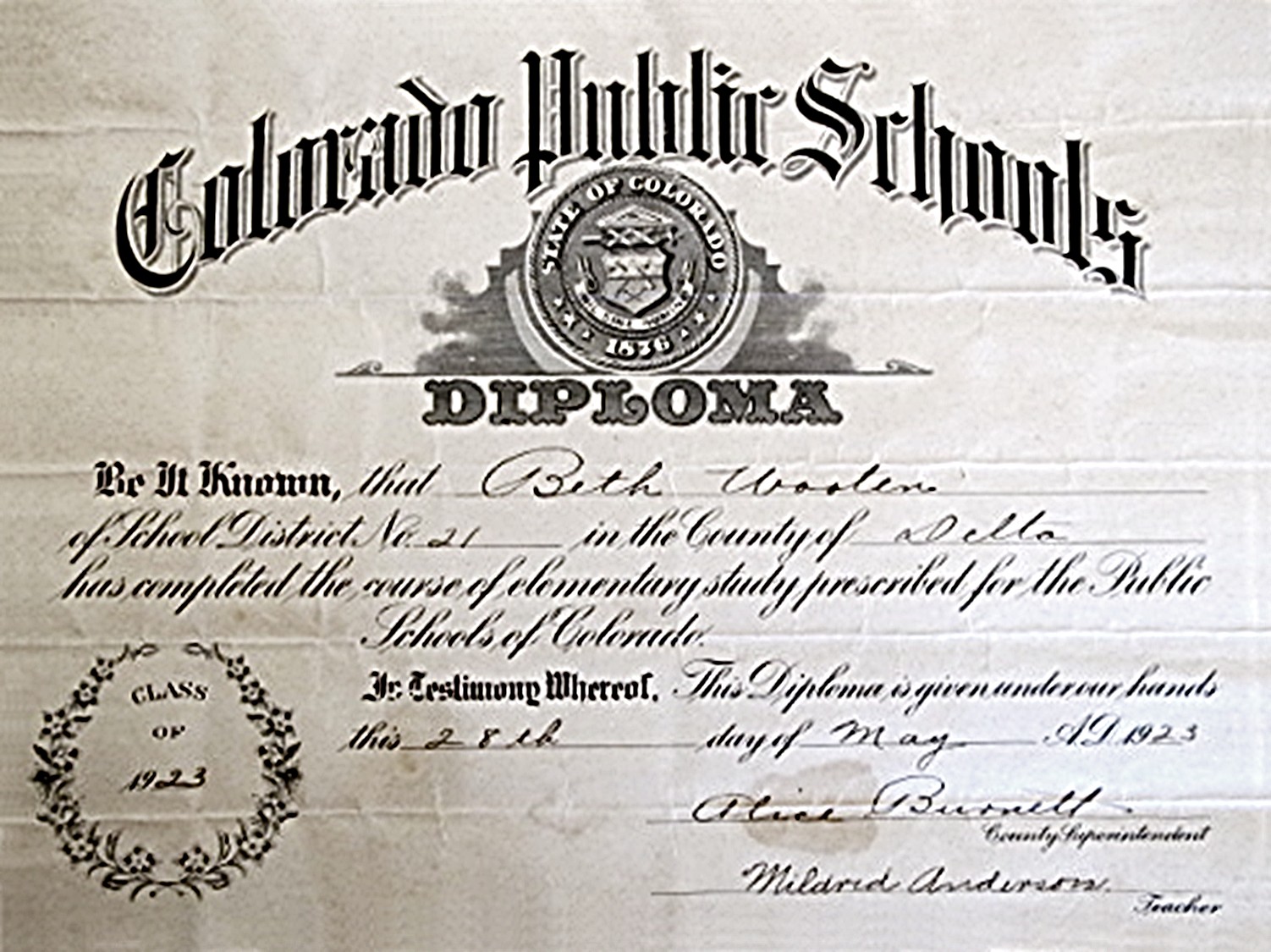 Nellie Elizabeth "Beth" Wootton graduated from the 8th Grade of School District No. 21, Delta Co., CO, on May 28, 1923.