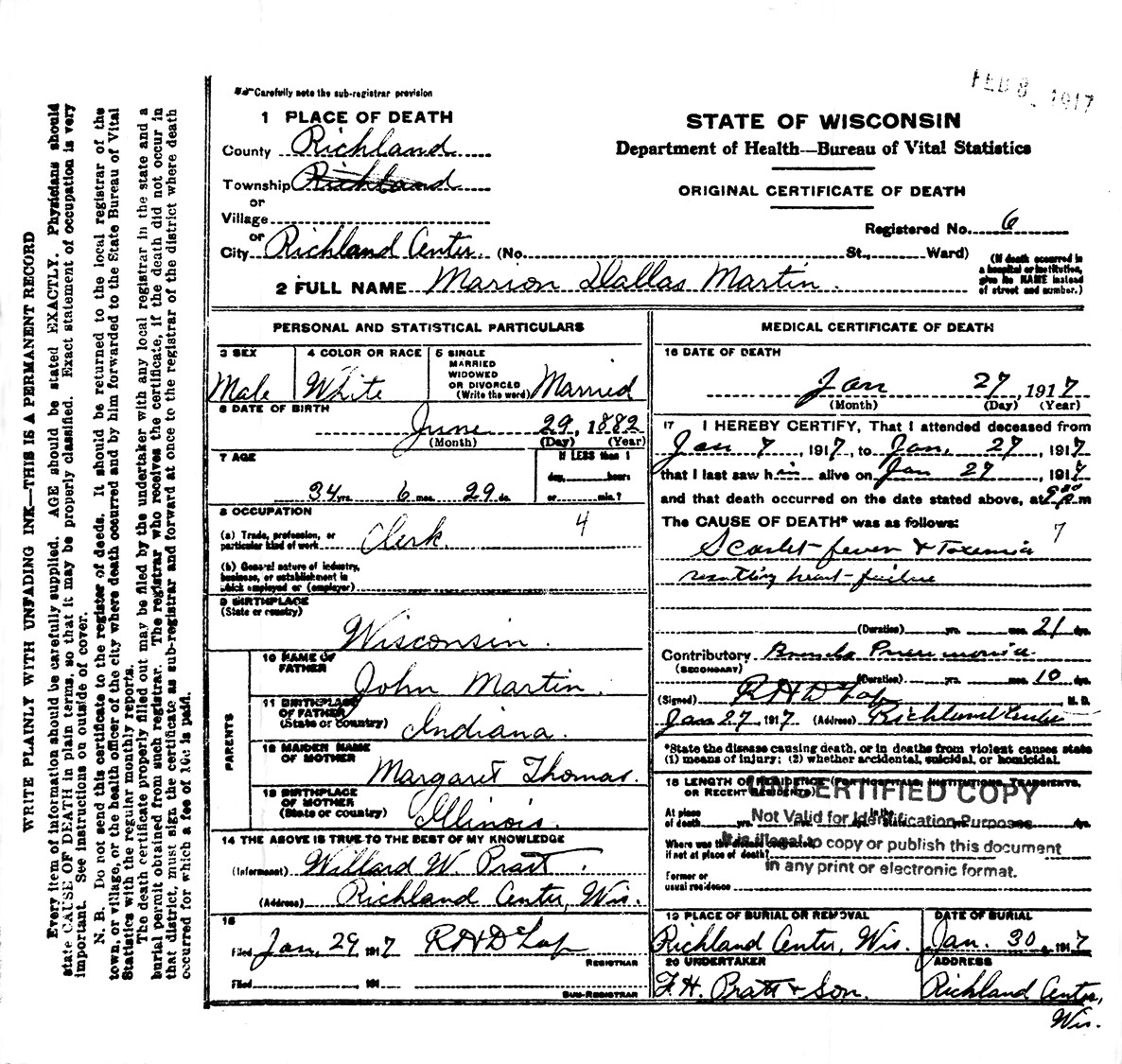 Marian Dallas Martin died January 27, 1917, in Richland Center, Richland Co., WI, at age 33. Buried in Richland Center Cemetery, Richland Center, Town of Richland, Richland Co., WI.