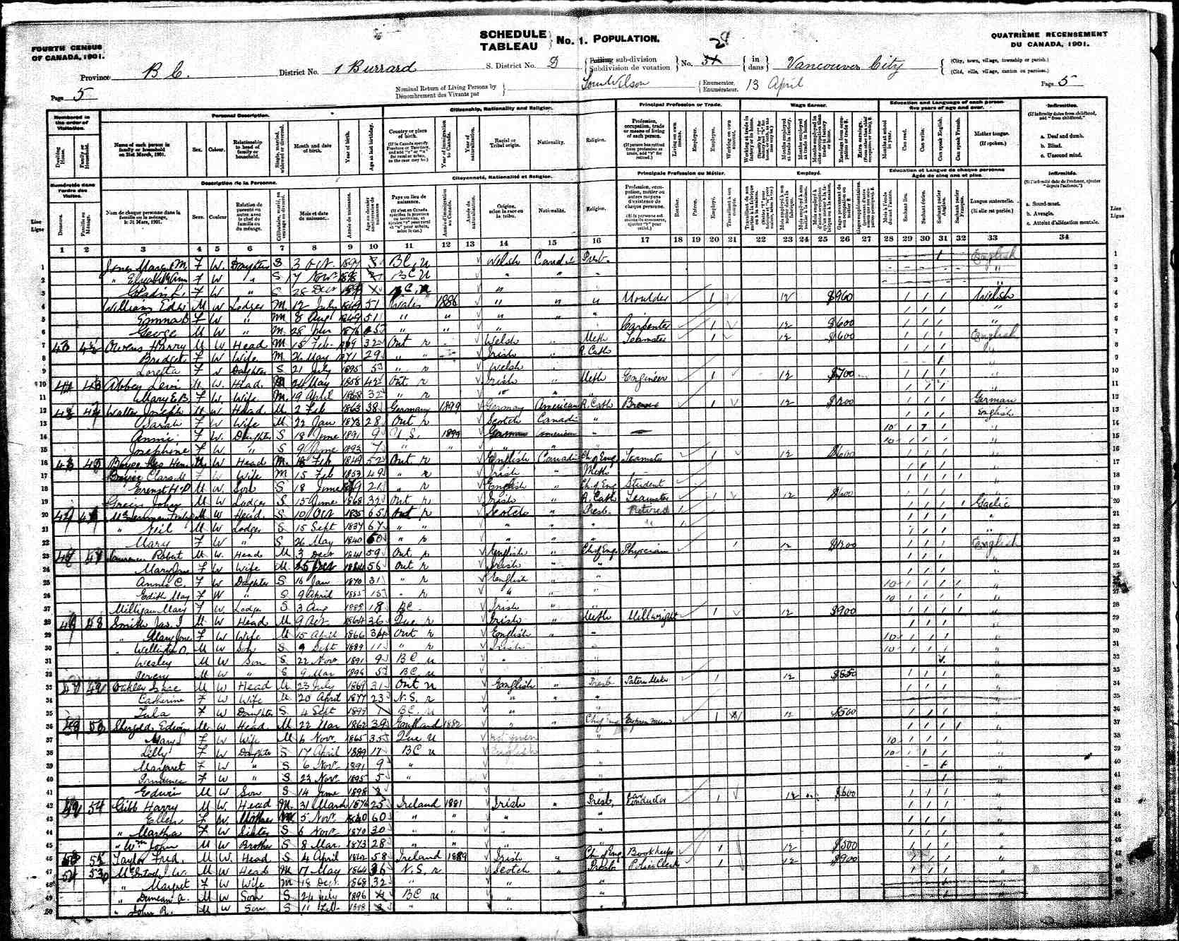 The 1901 Canadian Census taken on April 13, 1901, shows Levi Abbey (age 42) born May 24, 1858, in Ontario is a head of household Engineer living in the City of Vancouver, Burrard District, British Columbia, Canada. Living with him is his wife, Mary E. B. Abbey (age 32) born April 19, 1868, in Ontario, Canada.