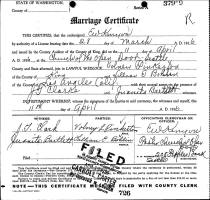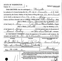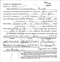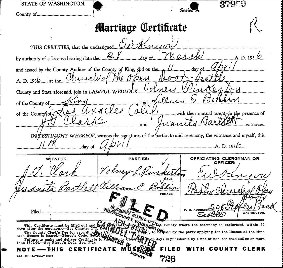 Volney Llewellyn Pinkerton and Lillian Eleanor Bohlin were married April 11, 1936, at the Church of the Open Door, Seattle, King Co., WA.