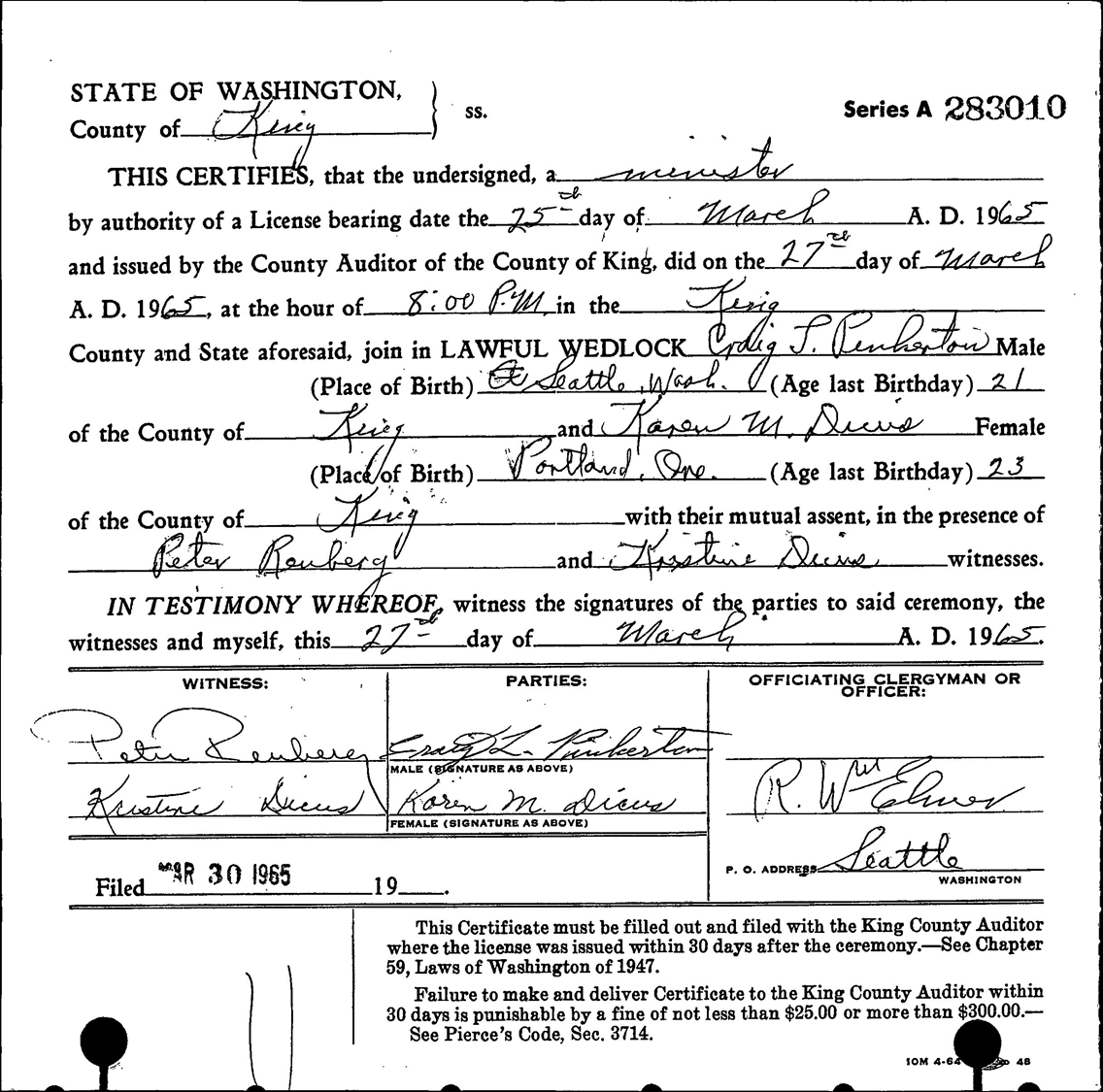 Craig Leslie Pinkerton and Karen Margaret Dicus were married March 27, 1965, at Green Lake Evangelical United Brethren Church, Seattle, King Co., WA.