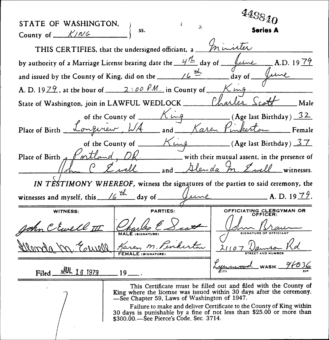 Charles E. Scott and Karen Margaret (Dicus) Pinkerton were married June 16, 1979, in Lynnwood, King Co., WA.
