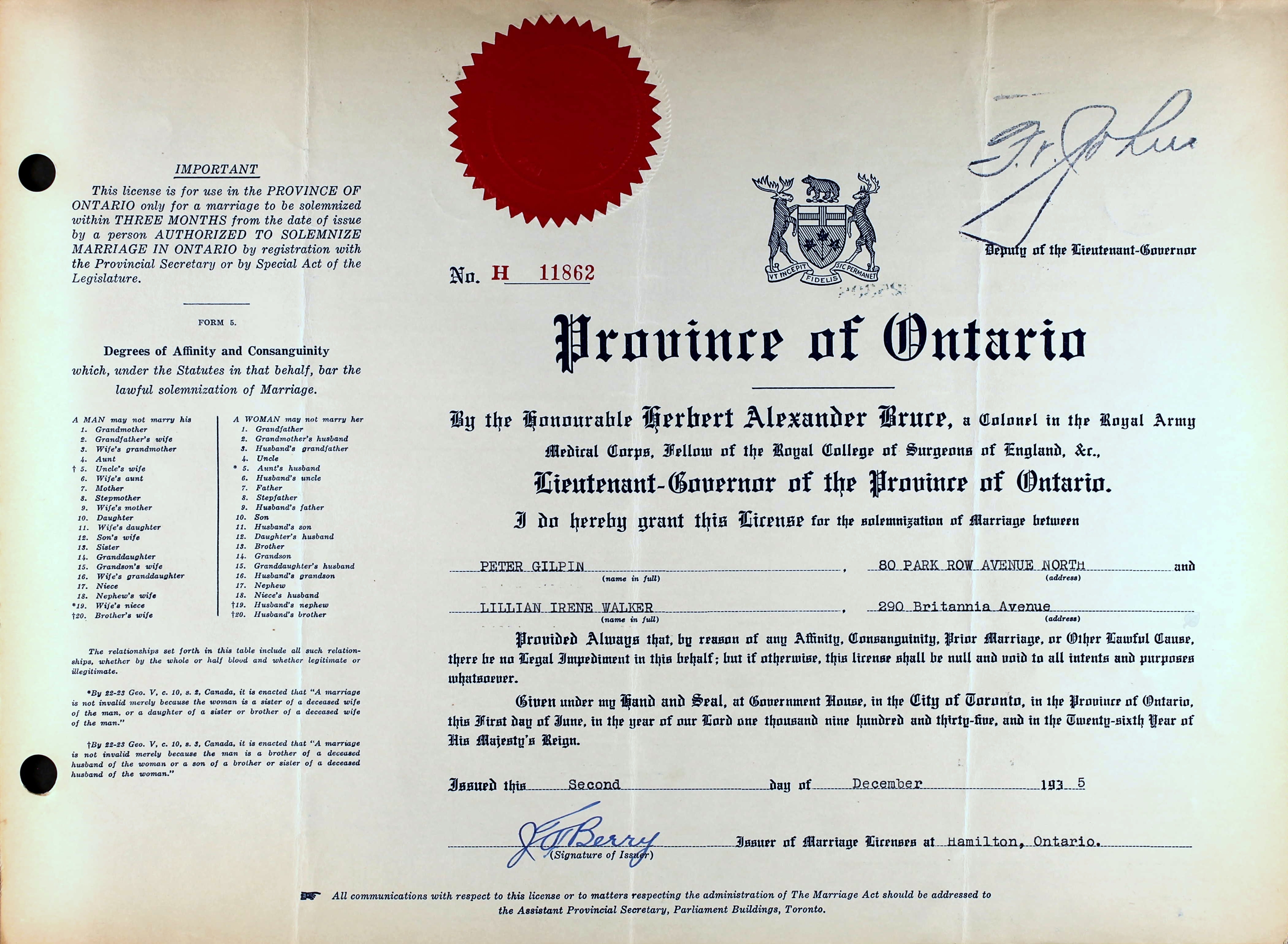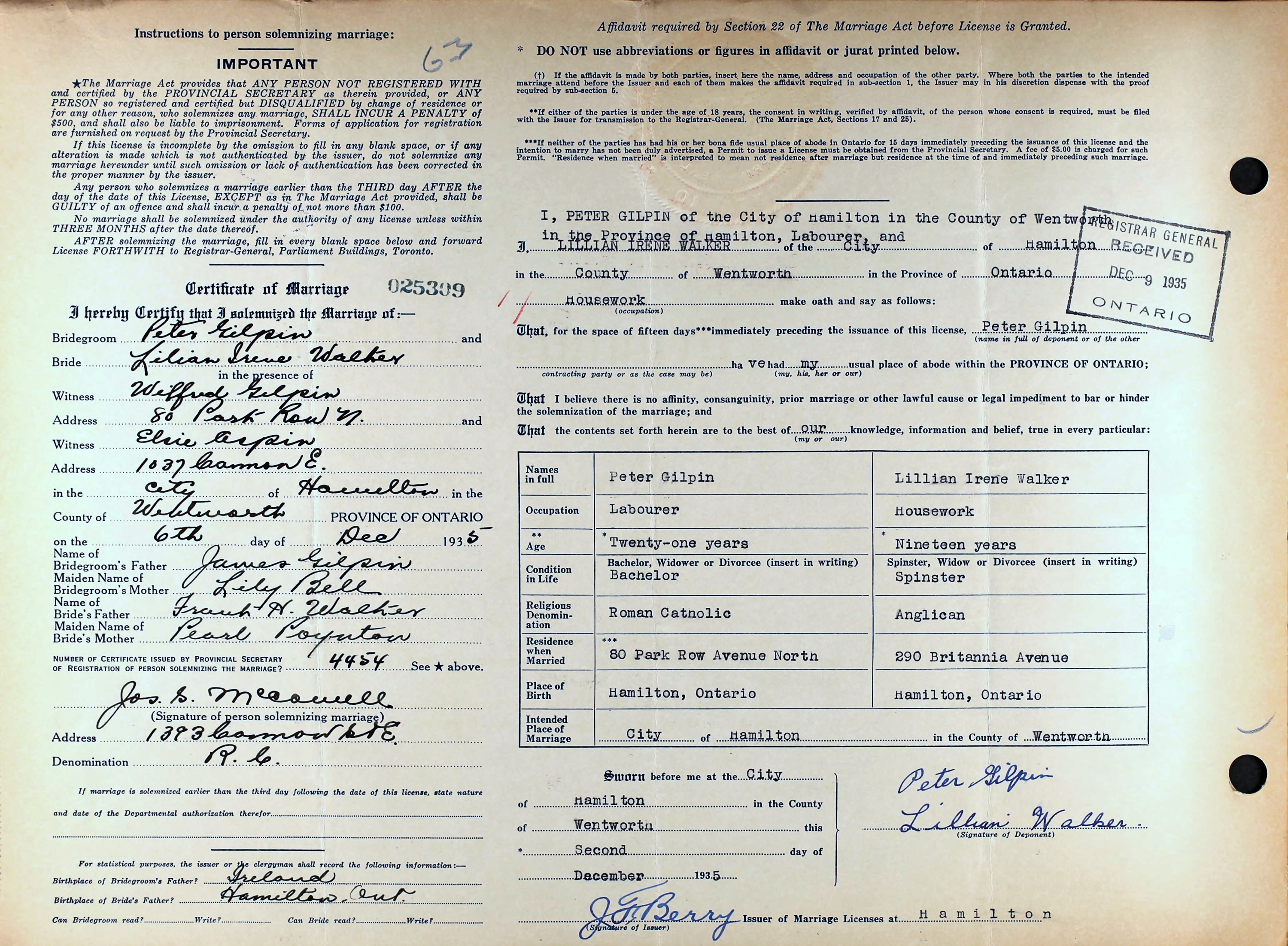 Peter Arthur Gilpin (age 21), a bachelor, and Lillian Irene Walker (age 19) a maiden, were married December 6, 1935, in Hamilton, Wentworth Co., Ontario, Canada.
