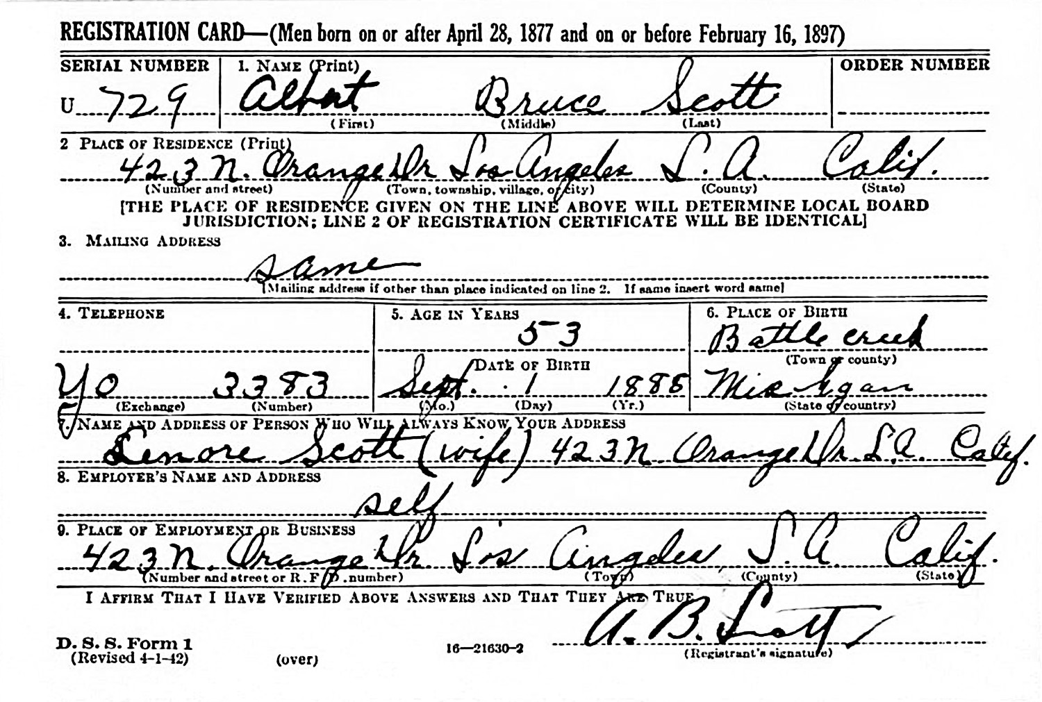 Albert Bruce Scott was born September 1, 1888, in Battle Creek, Calhoun Co., MI.