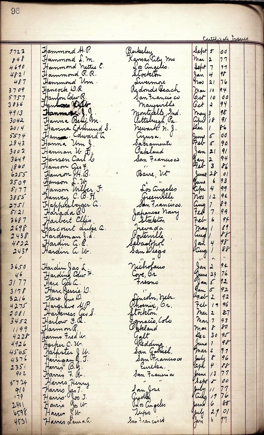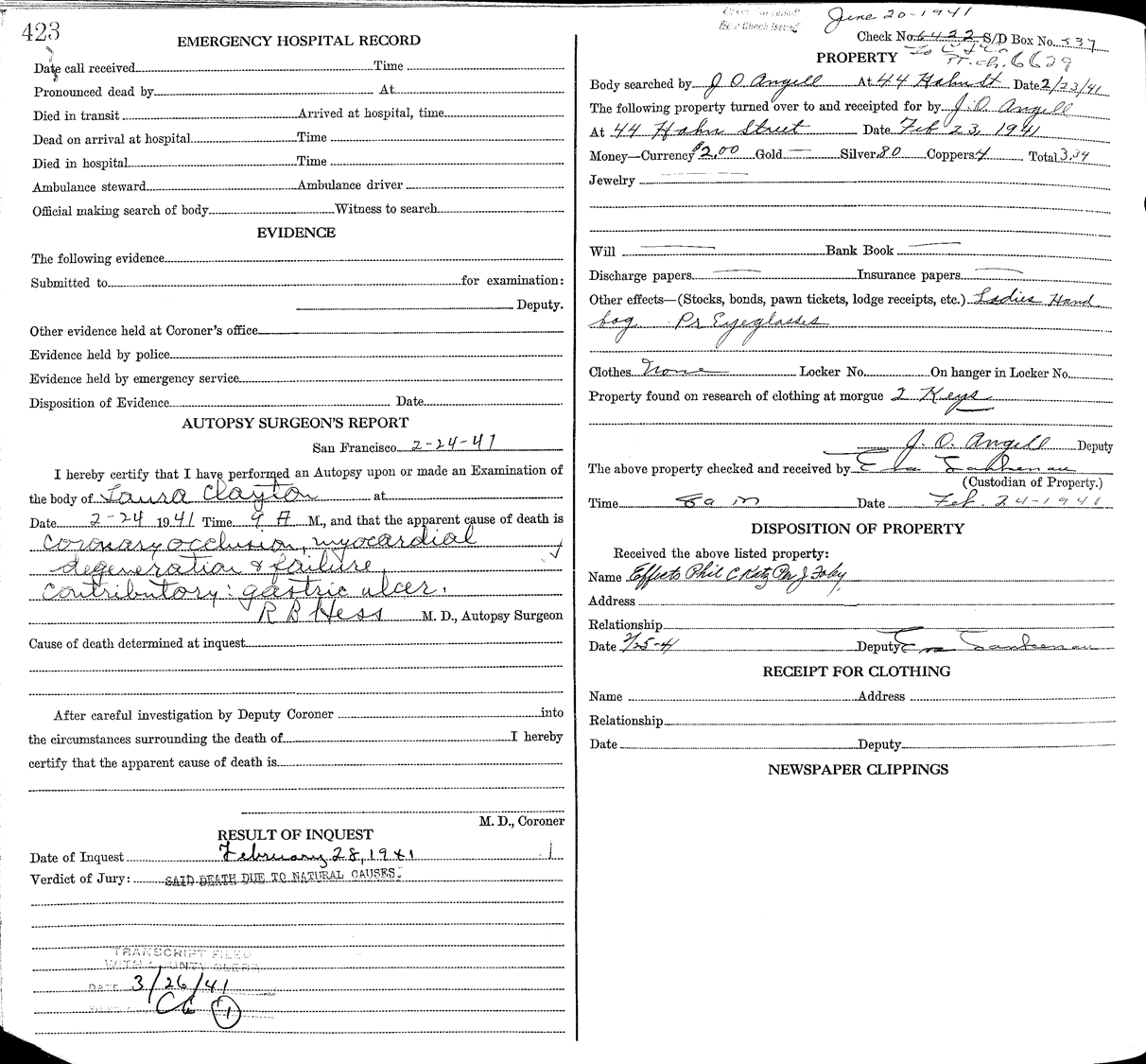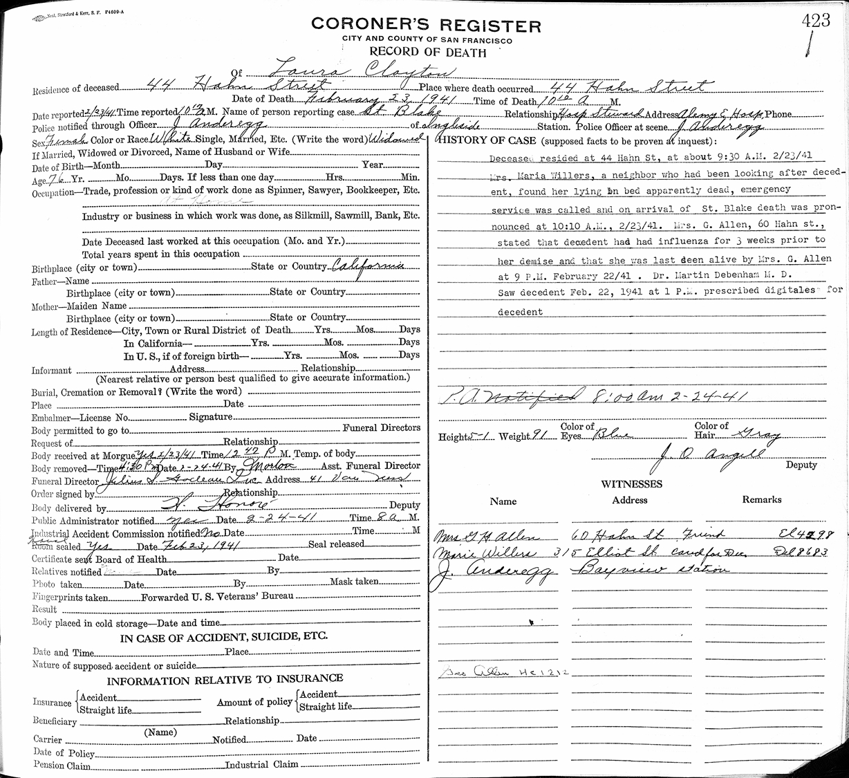 The 1922 San Francisco City Directory shows Clayton Laura A. widow r 44 Hahn, City of San Francisco, San Francisco Co., CA.