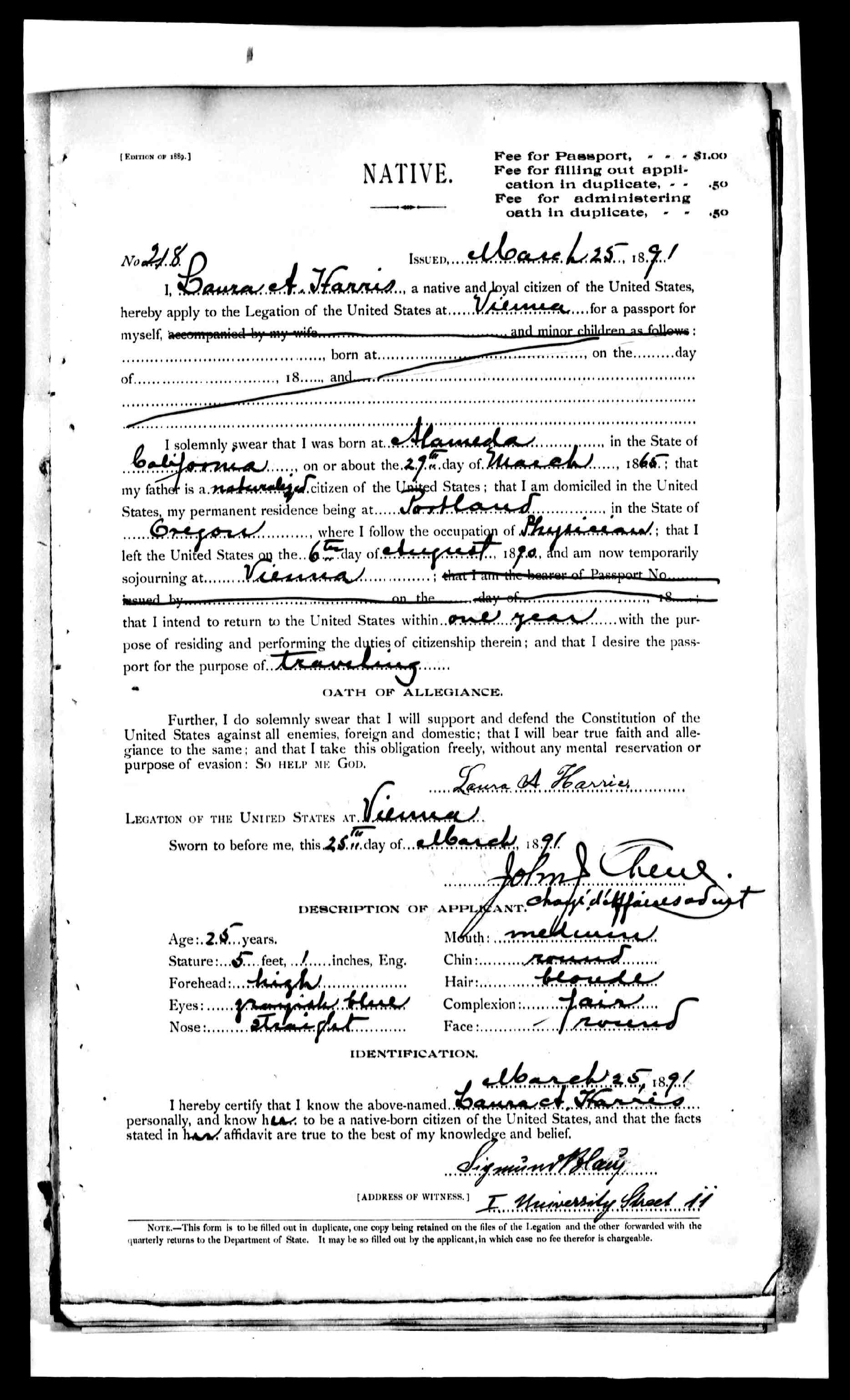 On August 6, 1890, Laura A. Harris (born March 29, 1865, in Alameda, CA, and a Physician and a permanent resident of Portland, OR, departed for Vienna, Austria, for additional schooling at the University of Vienna. Her Emergency Passport Application dated March 25, 1891, in Vienna, Austria, stating her intention to return to the United states within one year for the purpose of traveling, is shown below. Age 25, 5 feet 1 inch Tall; High Forehead; Grayish-Blue eyes; Straight Nose; Medium Mouth; Round Chin; Blonde Hair; Fair Complexion; Round Face.