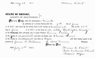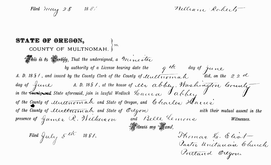 Charles O. Harris (age 23) and Lorinda Annena "Laura" Abbey (age 16) were married June 22, 1881, at the house of Mr. Abby, Washington Co., OR.