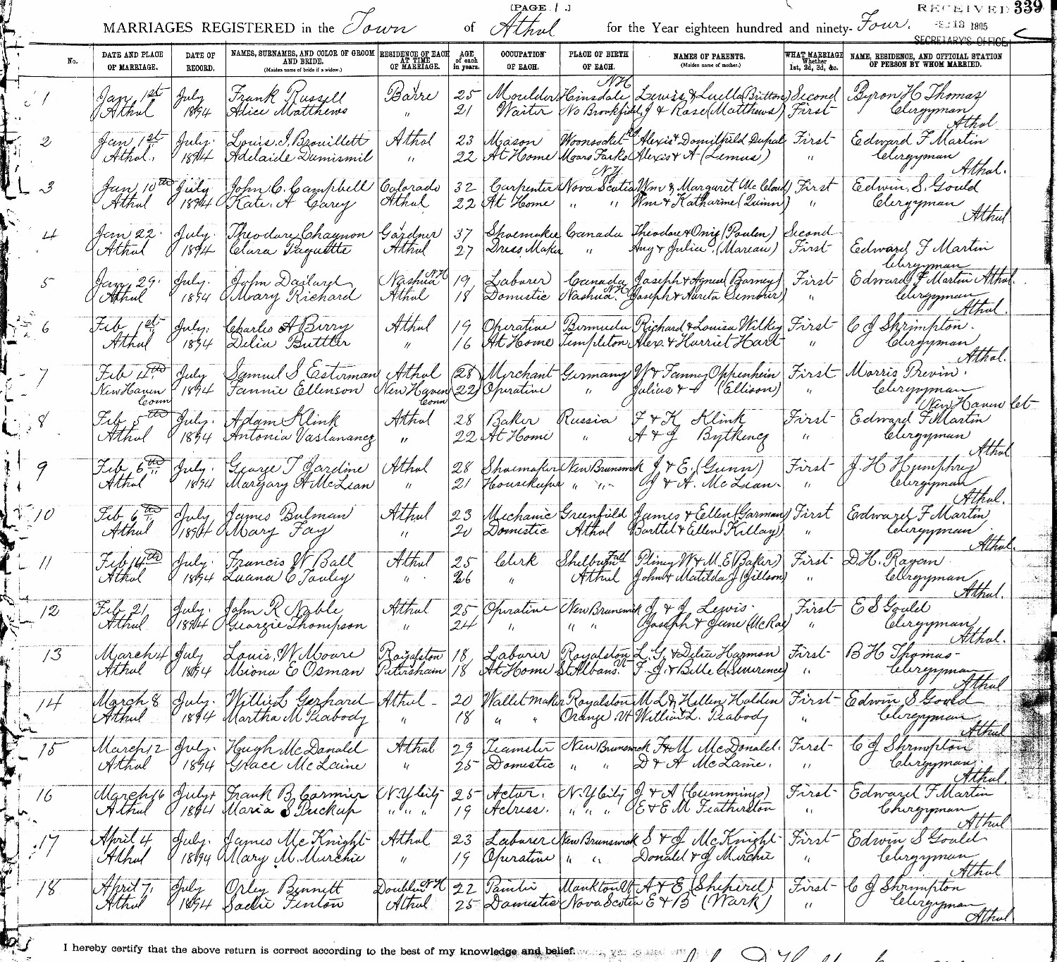 Frank Baruch Cormier (age 25) a bachelor, and May Uhl/Buckley (age 19), a maiden, were married May 16, 1894, in Athol, Worcester Co., MA.