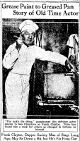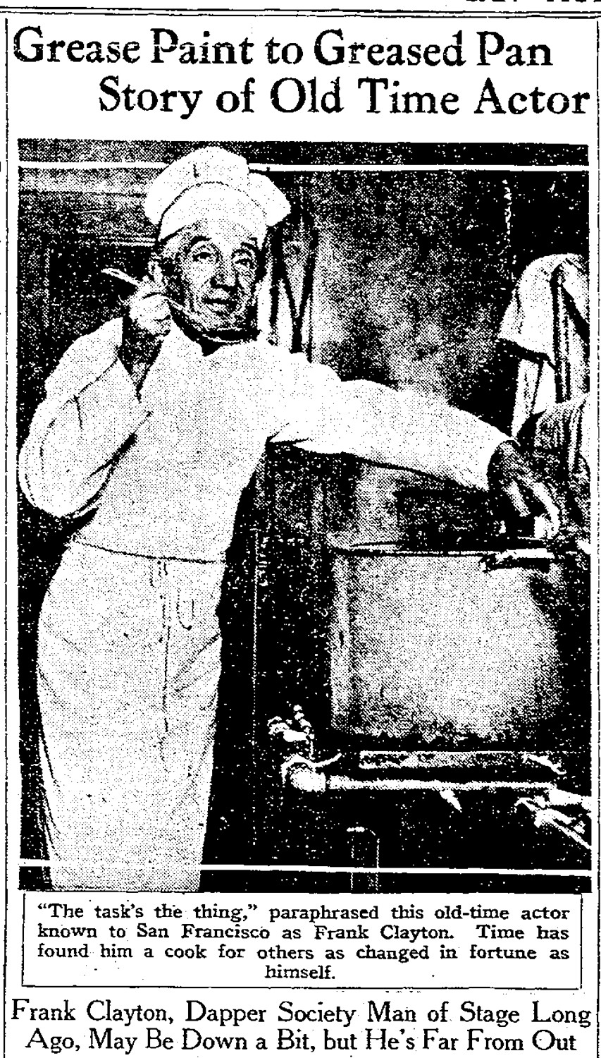 For a delightful tete-a-tete with an actor who knows his Fifth avenue swagger and what the well-dressed man is wearing, see the cook at the free food headquarters of the Volunteers of America on Howard street. It is a far cry from the grease paint to the grease in a frying pan and his heart is with the cosmetics, but with a sizzling pan in hand he is at least playing an actual part and not just waiting for one. This is Frank Clayton Cromier, who as Frank Clayton enacted dapper society roles and appeared here opposite his wife, May Buckley, more than thirty years ago. When Francis Power's play, "The First Born," had its sensational fifteen-week run in the old Alcazar Theater, Cromier was in the cast. Now with dramas of life, tragedies and bits of comedy about him he is not acting, but working to regain a position that will not be embarrassing should a casting director ask about his wardrobe. After four years of the well-known hard luck days of the theatrical profession he still has faith in his pep and the powers of makeup to do an up-to-date role. Odd jobs and his service overseas with the French Canadian forces taught him something about cooking - enough for the simple menus he now plans. If he could not serve as chef in a fashionable restaurant, he is at least actor enough to dress the part for, as he mixes soup for others who are seeing the seamy side of things, he appears in a spick-and-span apron and a tall starched cap, after the manner of the best French chefs. Inspiration for the stage came when as a boy of 19 and a first-nighter at the theaters of New York, he longed to follow in the footsteps of his favorite matinee idol, the late Kyrle Bellew. He called on a prominent actress who, he says, gave him a bit to get rid of him. Later he played his first important part in "The Highest Bidder," with E. H. Southern. Coming to San Francisco from New York in '95 the actor-cook was for two years with a stock company at the old Alcazar Theater, later moving about the country with various companies. Cromier likes best to recall the days with Bill Daley's company, when he was leading man, with Bill's wife, May Nancey, leading lady. Those were the days when he knew Hugh Toland, society actor of the Bohemian Club, and James Cruze, the director, was a near friend. Yes, those were the days - but with luck and effort, who knows but what they might come again.