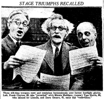 Old in years, but ever youthful in spirit, three veteran troupers before the footlights, who got together for a bit of reminiscing yesterday, agreed that the legitimate drama and vaudeville will again become the mainstay in the amusement field. Frank Clayton, one of San Francisco's oldest actors, who has appeared with such celebrities as Alexander Salvivi, E. H. Sothern and William Faversham, feels that the "road show" is coming back with a bang. Clayton, who played juvenile roles for Mrs. Minnie Maddern before she became Mrs. Fiske, at the old Bush Street Theater in 1889, was host to the little party of old-timers. He represented the "legitimate" drama, while his two guests, Tom Harris, 86, and Dave Genaro, 61, were the vaudevillians - and still are, for they are appearing with four others as "Youngsters of Yesterday," headline attraction at the R-K-O Golden Gate Theater this week. Harris, who danced before President Abraham Lincoln in 1864, still does a mean buck dance. His hair is snow white and his features are a bit seamed, and he looks like Mark Twain, but he says he won't quit for another twenty years. Genaro, who created the cake walk, still does this dance for the younger generation. Both declare that vaudeville of the big-time variety will be back soon. Just to prove to a few other old-timers that age can't stop a pair of nimble feet, the trio went out to Laguna Honda Home yesterday and did a few steps and then finished by singing "Sweet Adeline."