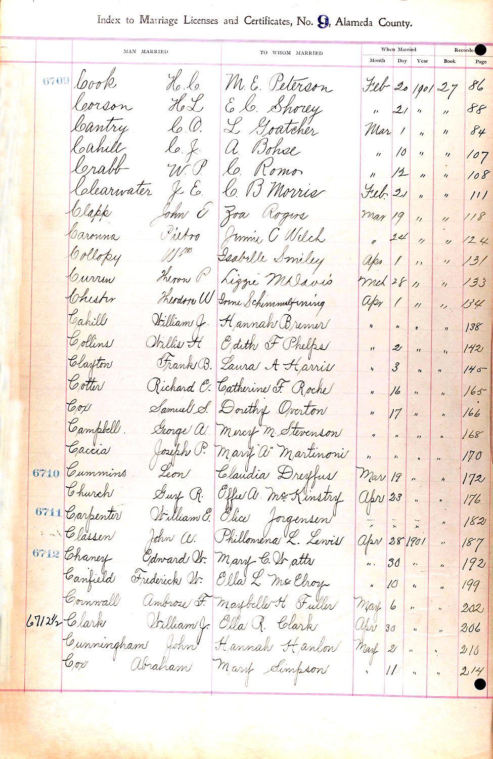 Frank Clayton (age 23, born in Watsonville, CA) and Madge Ryan (age 21, born in San Francisco, CA).