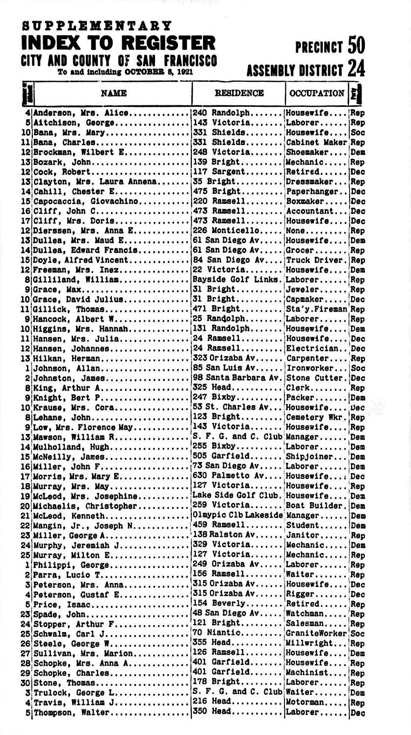 The 1920 San Francisco City Voter Registration List dated October 2, 1920, shows Mrs. Laura Annena Clayton is a Republican Dressmaker living at 35 Bright, City of San Francisco, San Francisco Co., CA.