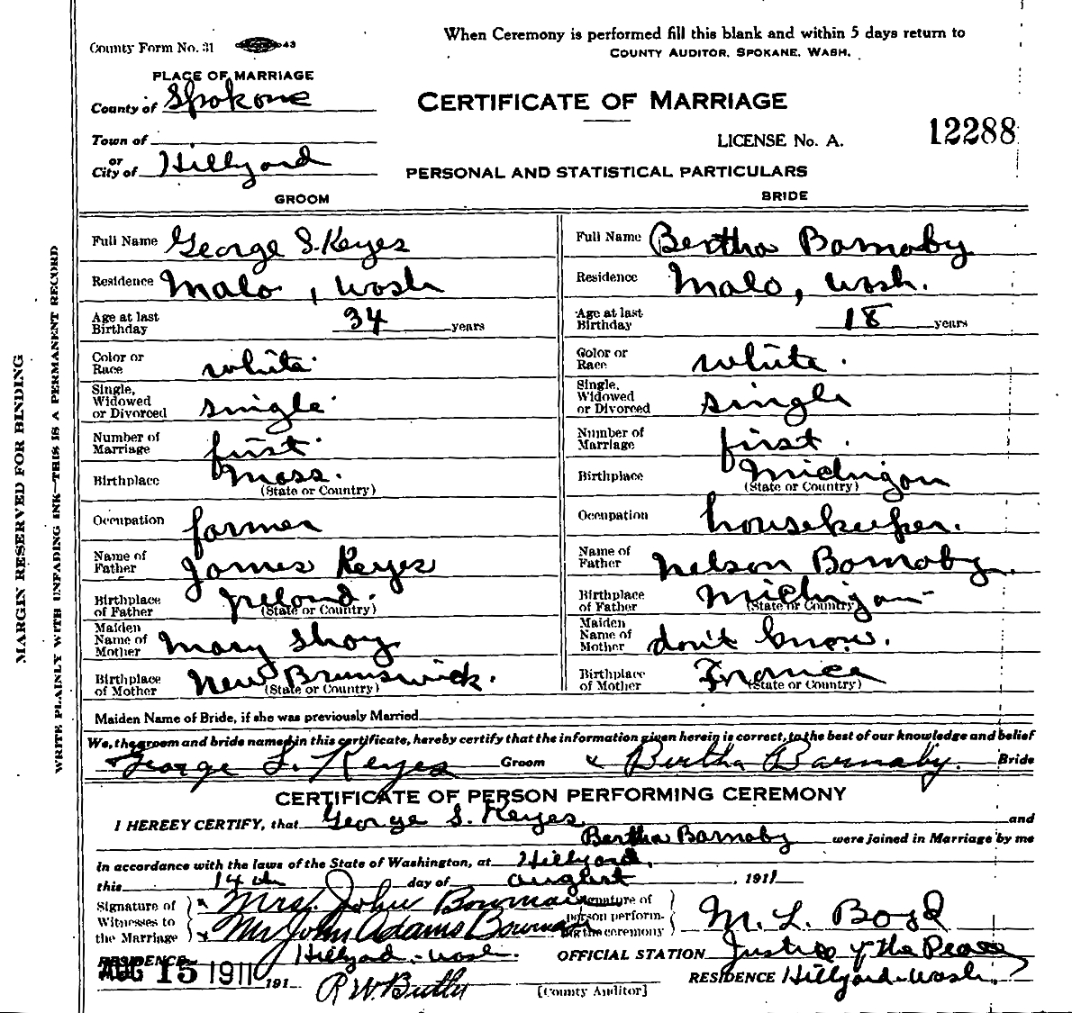 George Stephenson Keyes and Alberta Mary "Bertha" Barnaby were married August 14, 1911, in Hillyard, Spokane Co., WA.