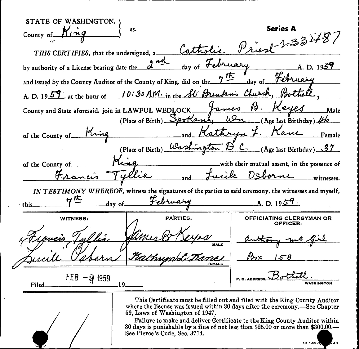 James B. "Jim" Keyes and Kathryn Louise "Kay" Kane were married February 7, 1959, at St. Brendan's Church, Bothel, King Co., WA.