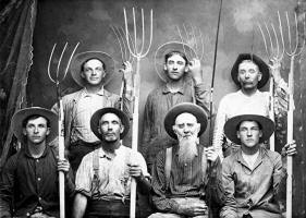The elderly man holding the fishing pole is Adam Bickett Kendall, 1829-1911. The young man in the middle of the back row is his nephew David Herman Kendall, and the rest are likely family members too. Everybody except Adam Bickett Kendall is ready for haying - probably on his farm near Lee�s Summit, Missouri.