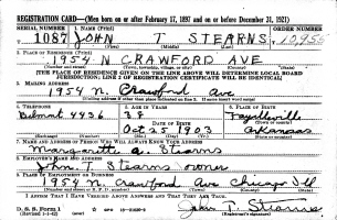 The April 10, 1942, WWII Draft Registration Report shows John T. Stearns (age 38) born October 25, 1903, in Fayetteville, AR, is Self Employed, and is living at 1954 N. Crawford Ave., Chicago, Cook Co., IL. Margarette A. Stearns at the same address is the person who will always know his address.