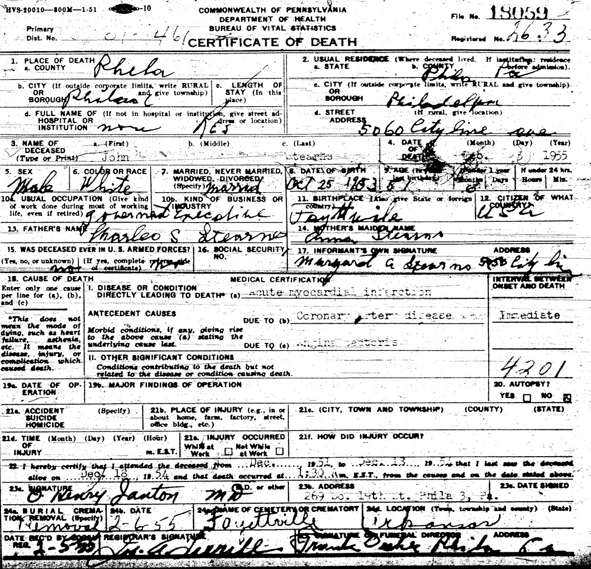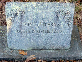 John Tate Stearns died February 5, 1955, at his residence, 5060 City Line Ave., City of Philadelphia, Philadelphia, Co. PA, at age 51. Buried in Stearns Cemetery (Gehring's Chapel Cemetery), Fayetteville, Fayetteville Twp., Washington Co., AR.