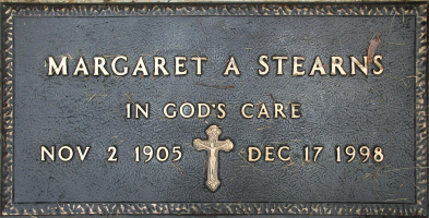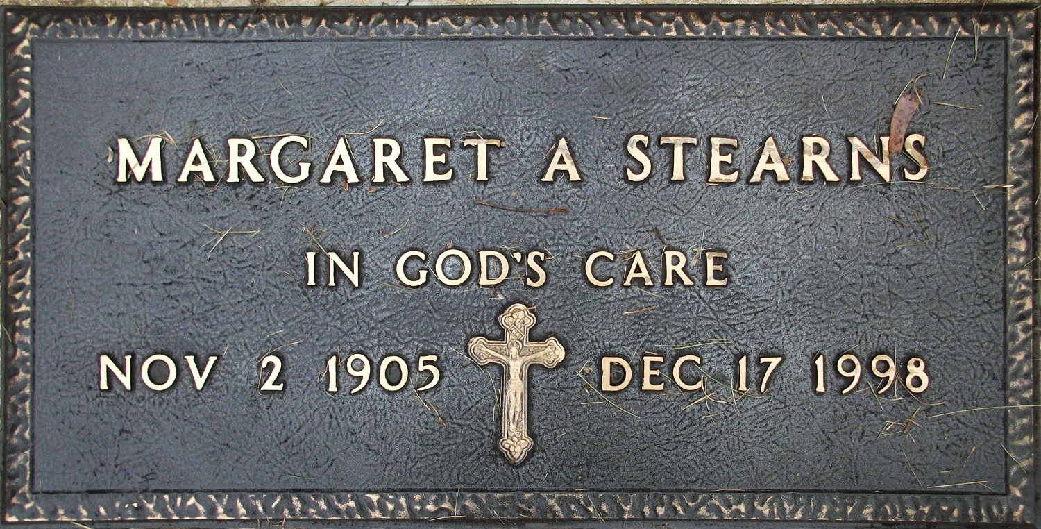 Margarette A. "Margaret" (Wansor) Stearns died December 17, 1998, in Eagle River, Vilas Co., WI, at age 93. Buried in Block 5 Lot 060 Saint Peter Catholic Cemetery, Eagle River, Vilas Co., WI.