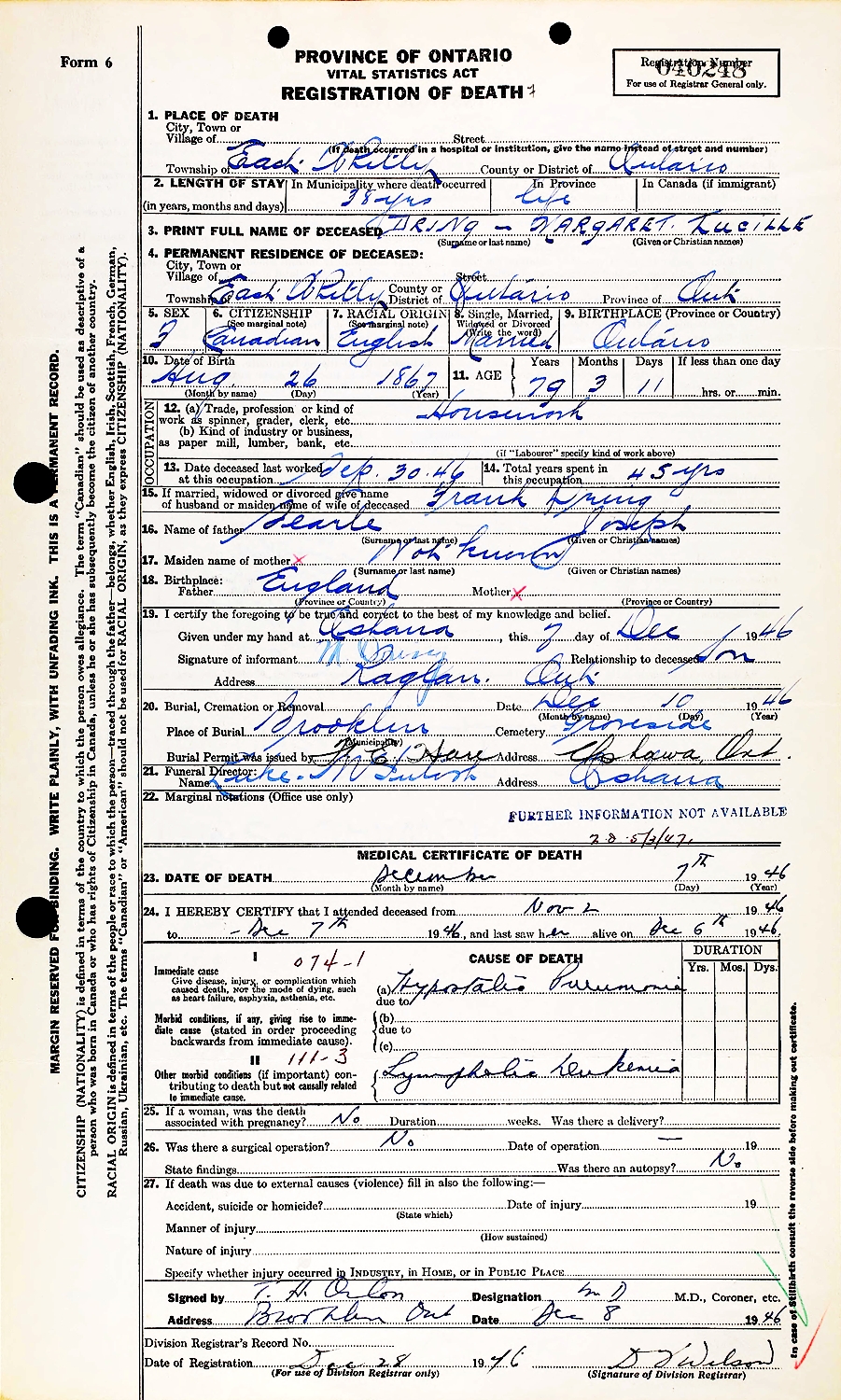 Margaret Lucille "Maggie" (Searle) Dring died December 7, 1946, in Ontario, Canada, at age 79. Buried in Groveside Municipal Cemetery, Brooklin, Whitby Twp., Durham Regional Municipality, Ontario, Canada.