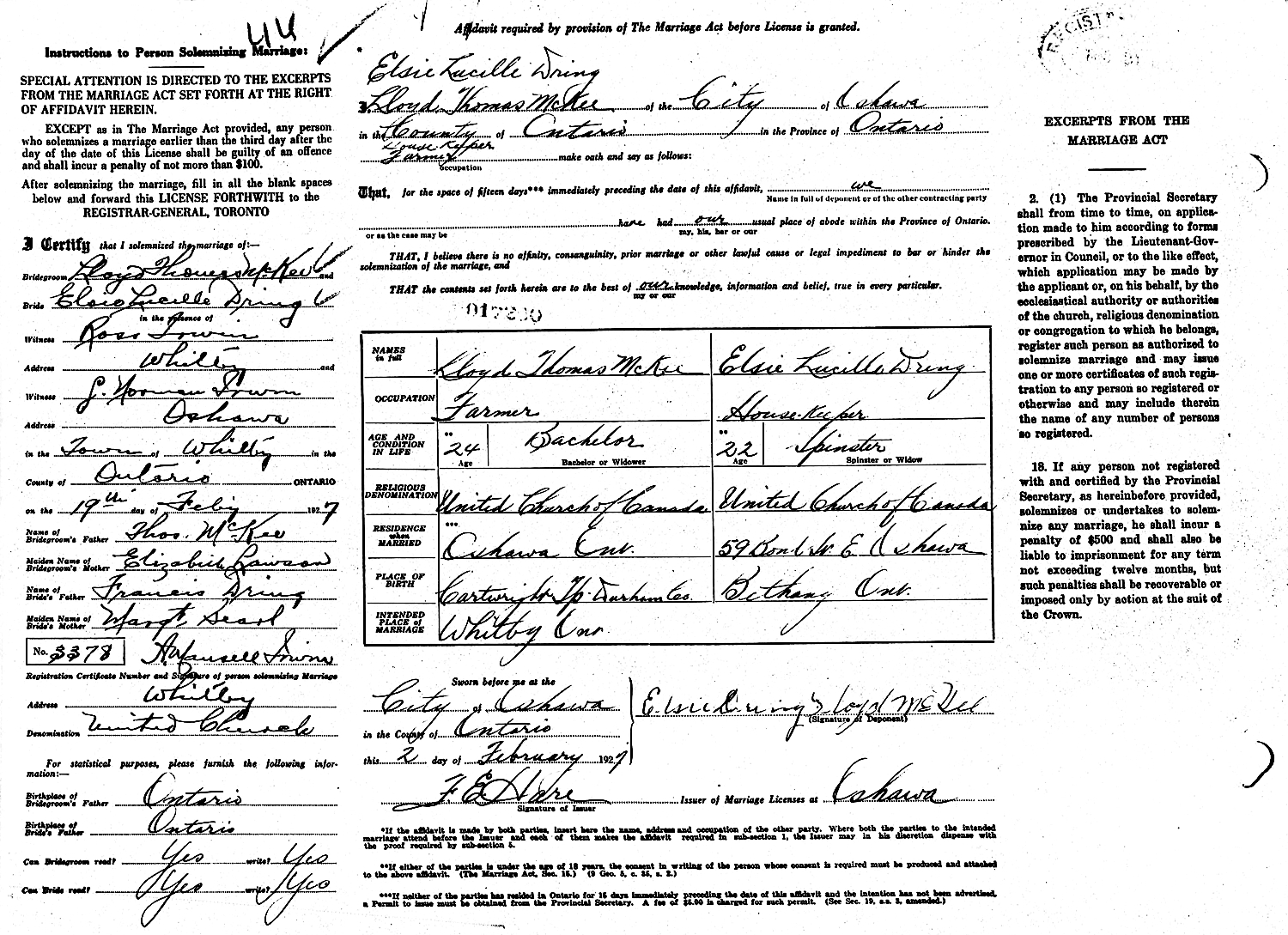 Lloyd Thomas McKee and Elsie Lucilla "Lucille" Dring were married February 19, 1927, in the Town of Whitby, Oshawa, Ontario, Canada.
