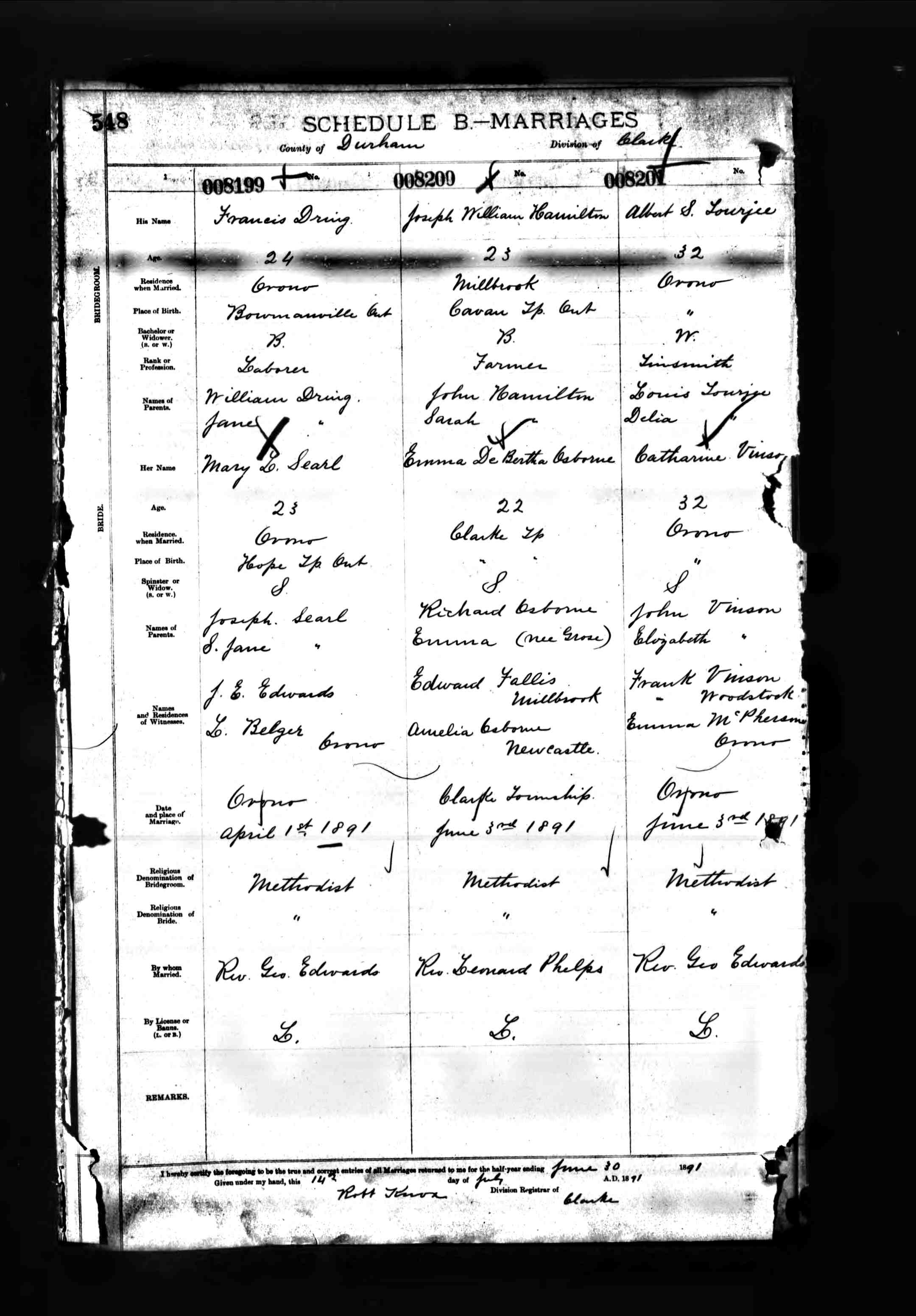 Francis "Frank" Dring and Margaret Louisa Searle were married April 1, 1891, in Orono, Durham Co., Ontario, Canada.