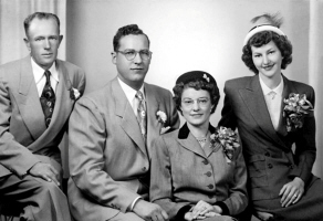Thure Bror Orefalk and Cleo Frances (Herman) Mattson ( Alice Frances Herman's youngest sister) wedding, October 27, 1951, in the parish house of St. Stephen Catholic church, Beulah, Mercer Co., ND . George T. Nelson is on the far left, and Marilyn Odell (Abbey) Gustafson is on the far right. Photo courtesy of Kay Koslan.