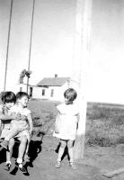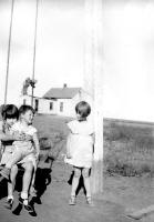 Kay Koslan comments: I remember visiting here when the root cellar (to the left of the Abbey children) was there, and there was also an outhouse. The outhouse was no longer there. The door in the background was likely the front door. The Abbey kids are either going to school or to church, I'll bet.