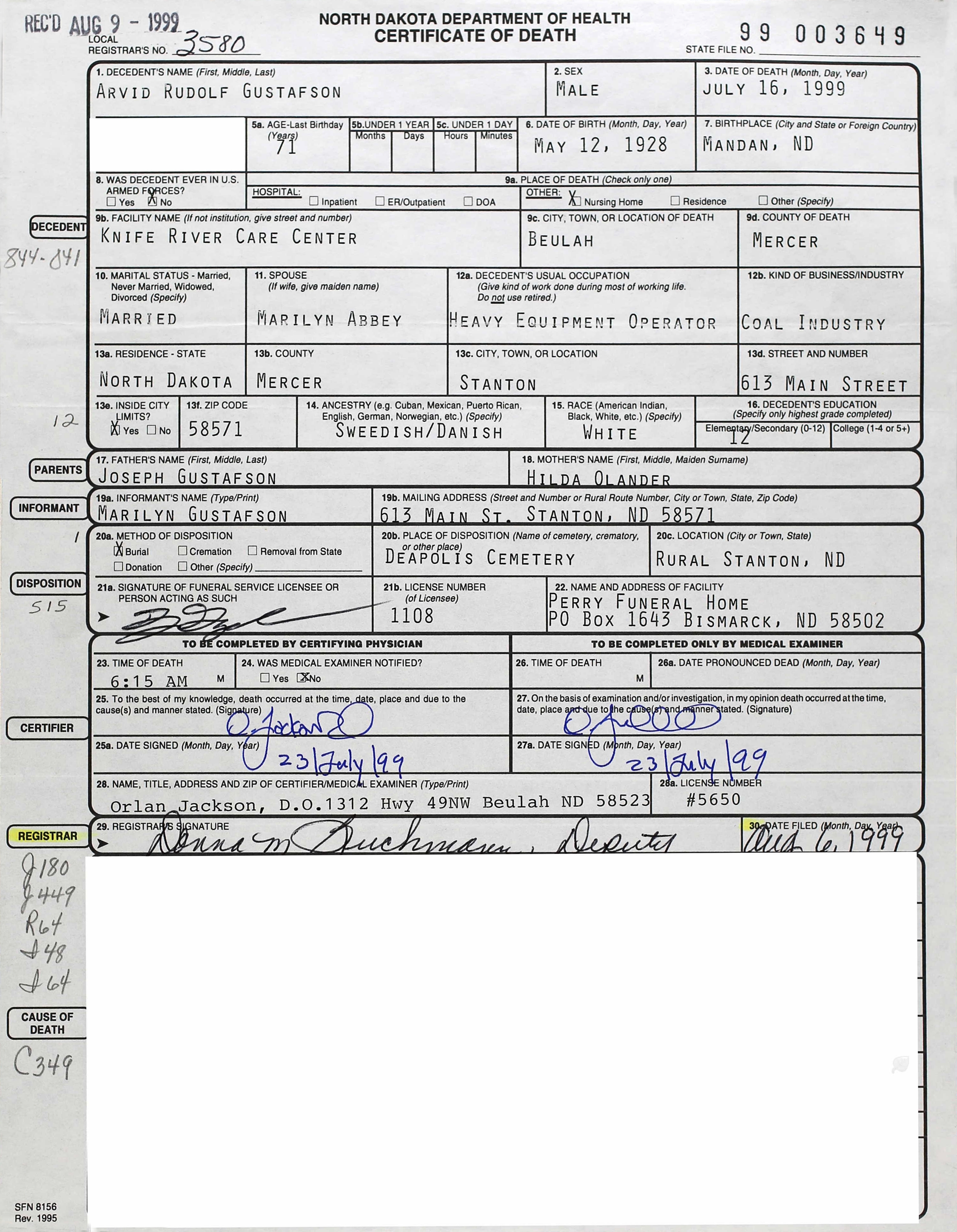 Arvid Rudolf Gustafson died July 16, 1999, at Knife River Care Center, Beulah, Mercer Co., ND, at age 71. Buried in Deapolis Cemetery, Mercer Co., ND. Buried in Deapolis Cemetery, Mercer Co., ND.