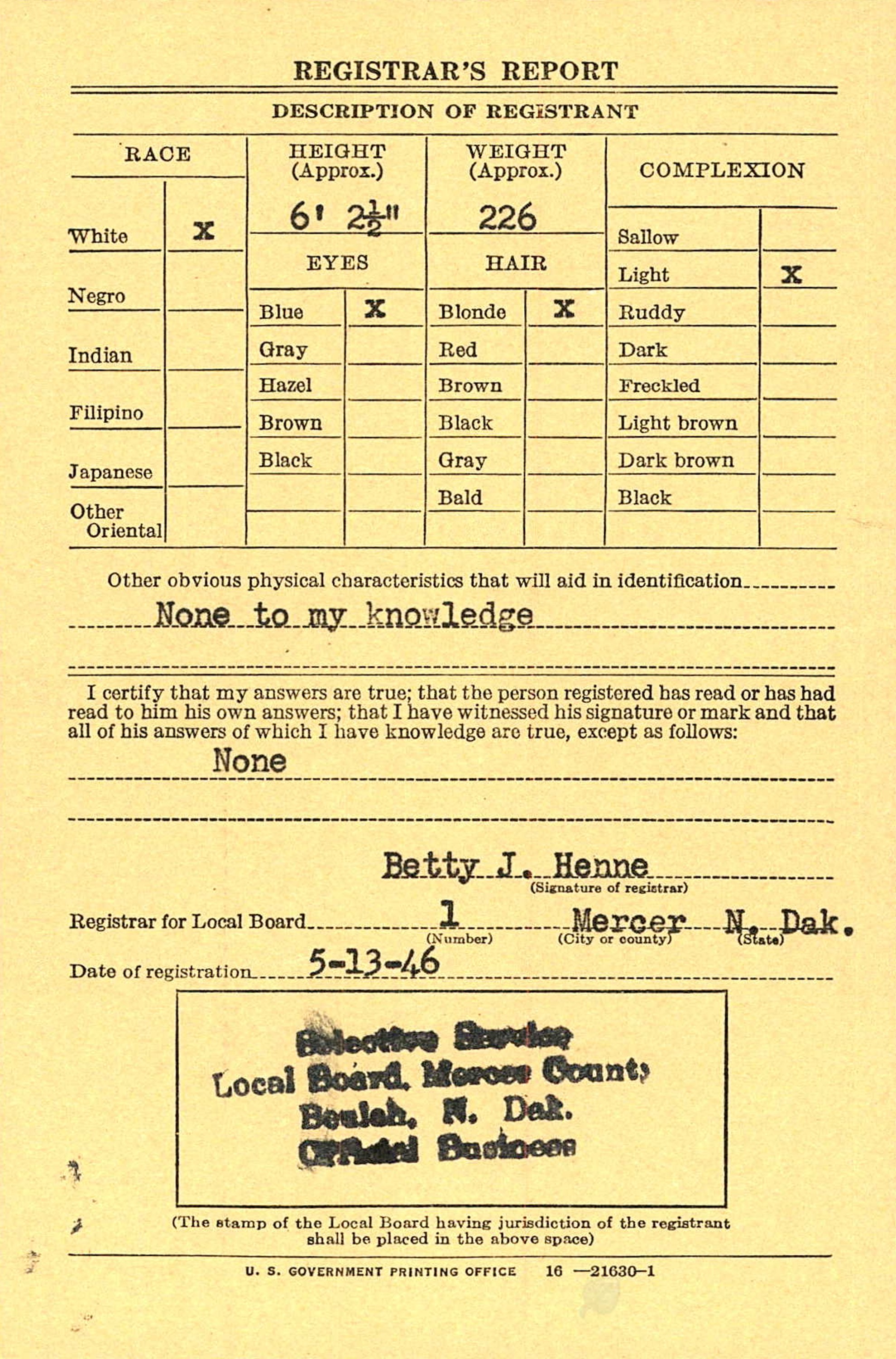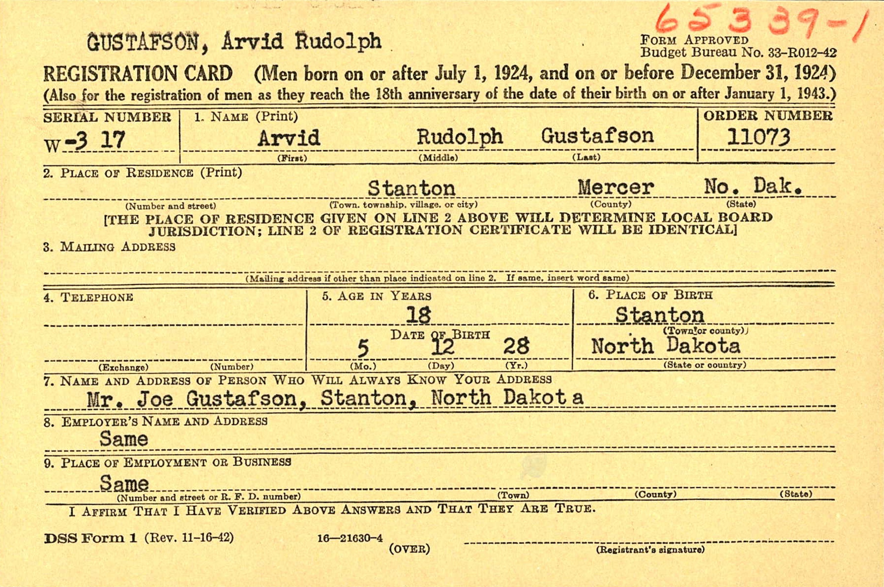 The WWII Draft Registration Report dated May 13, 1946, shows Arvid Rudolf Gustafson (age 18) born May 12, 1928, in Stanton, ND, is living in Stanton, Mercer Co., ND.