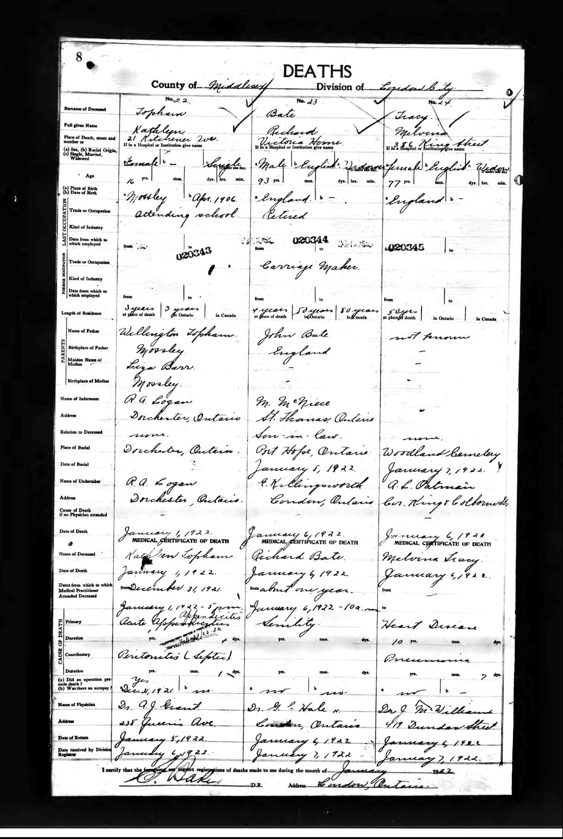 Richard Bate, age 93, a retired widowed Carriage Maker, died from senility on January 6, 1922, at Victoria Home, City of Lynden, Middlesex Co., Ontario, Canada.