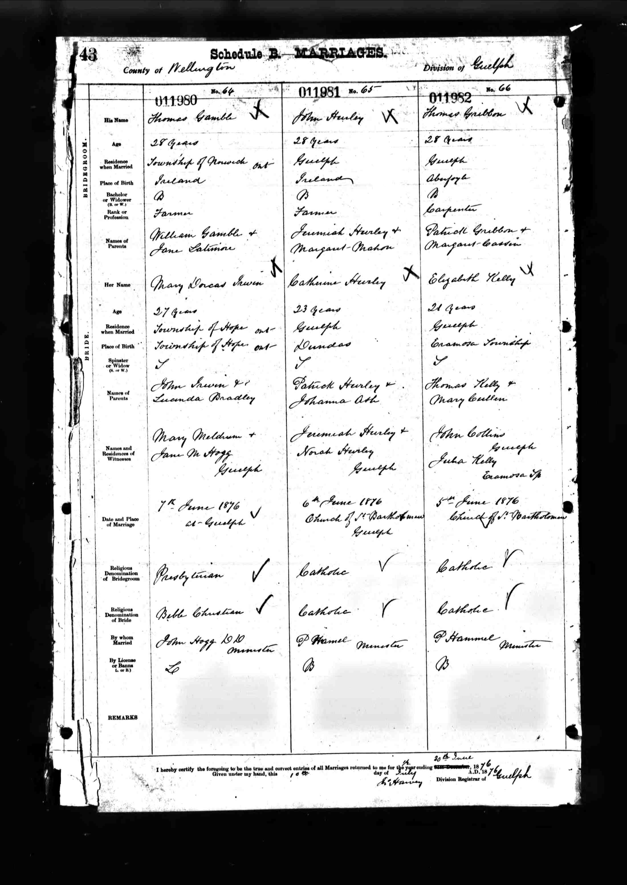 Thomas Gamble and Mary Dorcas Irwin were married June 6, 1876, in Guelph, Wellington Co., Ontario, Canada.