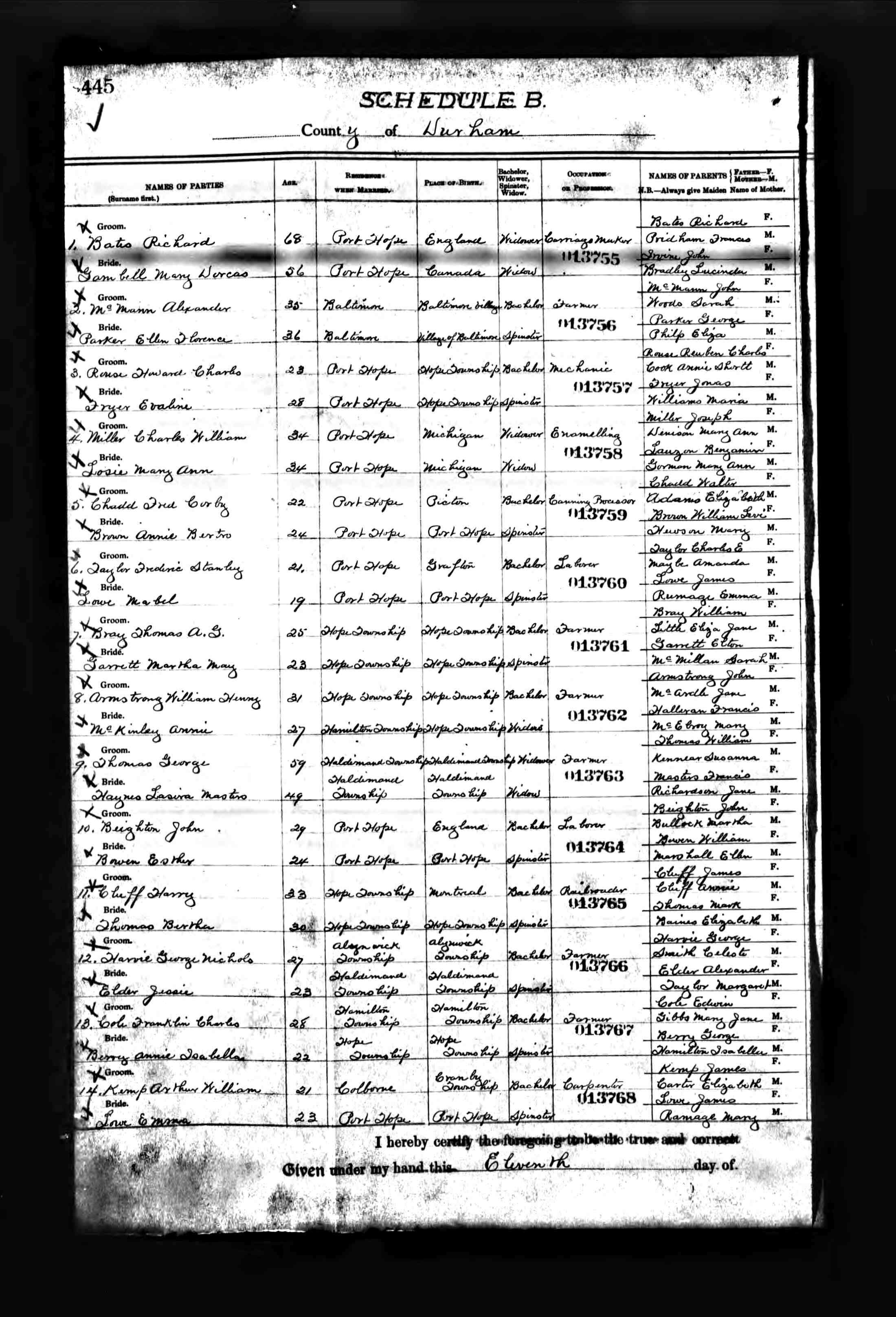 Richard Bate (age 68) and Mary Dorcas (Irwin) Gambell (age 56) were married January 12, 1904, in Port Hope, Durham Co., Ontario, Canada.