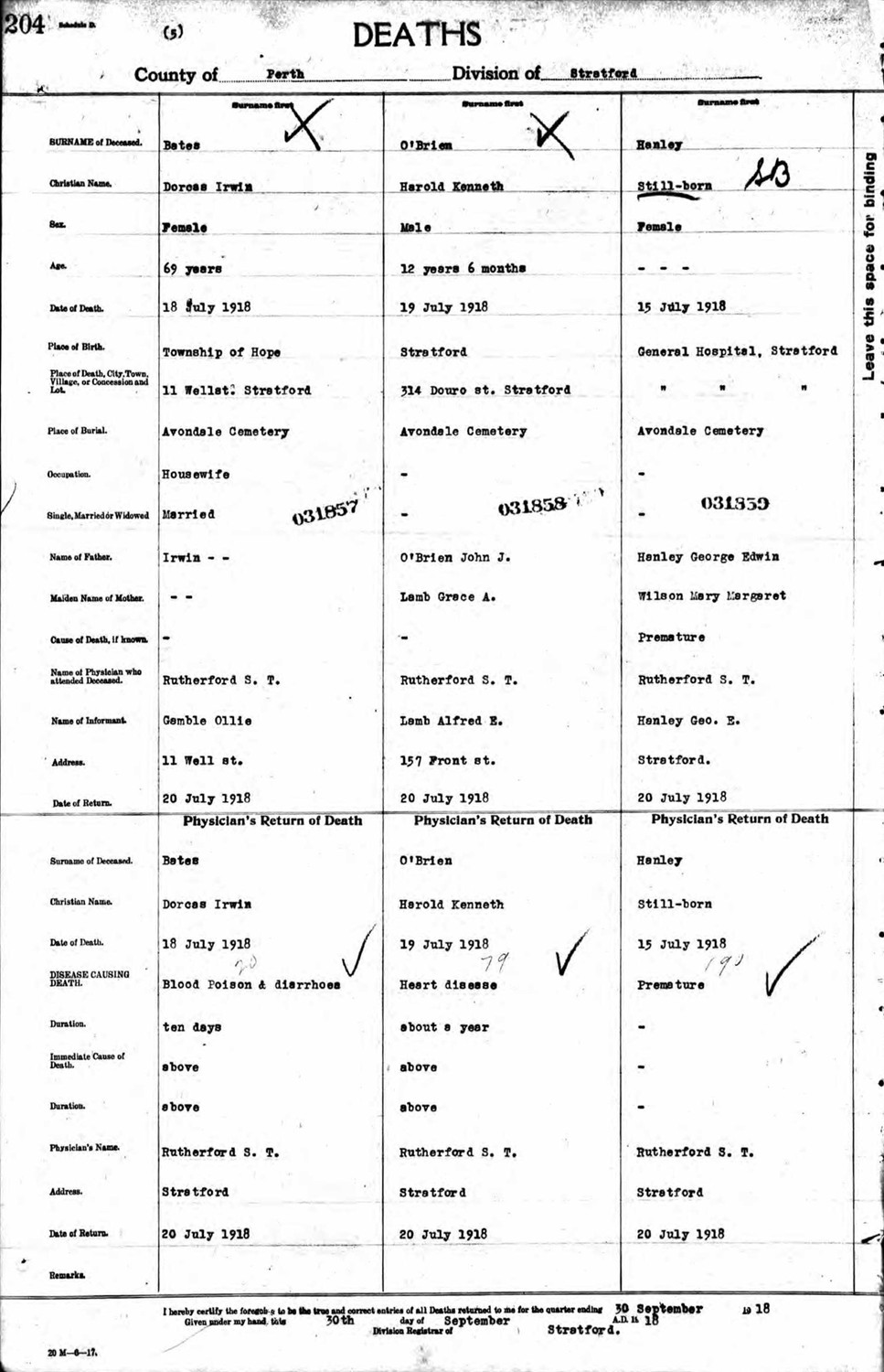 Mary Dorcas (Irwin) (Gamble) Bate died July 18, 1918, at 11 Well Street, Stratford, Perth Co., Ontario, Canada, at age 70. Buried in Section: Q; Lot: 298; Sub: 2, Avondale Cemetery, City of Stratford, Downie Twp., Perth Co., Ontario, Canada. Name on record: Dorica Bates. Cemetery interment date incorrectly listed as in 1920; should be 1918.