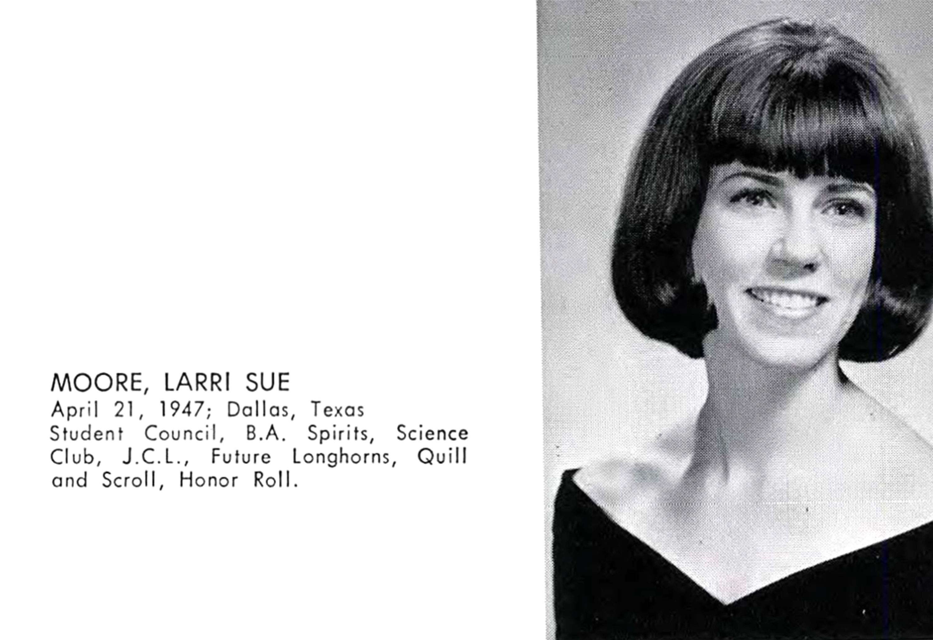 Larri Sue Moore was born April 21, 1947, in Dallas, Collin Co., TX. She is the daughter of Thomas Austin Moore, and Marion Keith Jessup. Larri graduated from Bryan Adams High School, Dallas, Dallas Co., TX, in 1965.