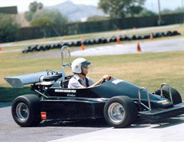 Gary Lewis Ray at the Malibu Grand Prix Scottsdale miniature racing park, ca. 1989. Gary was permitted to drive their fastest race car because he had previously qualified for their special license.
