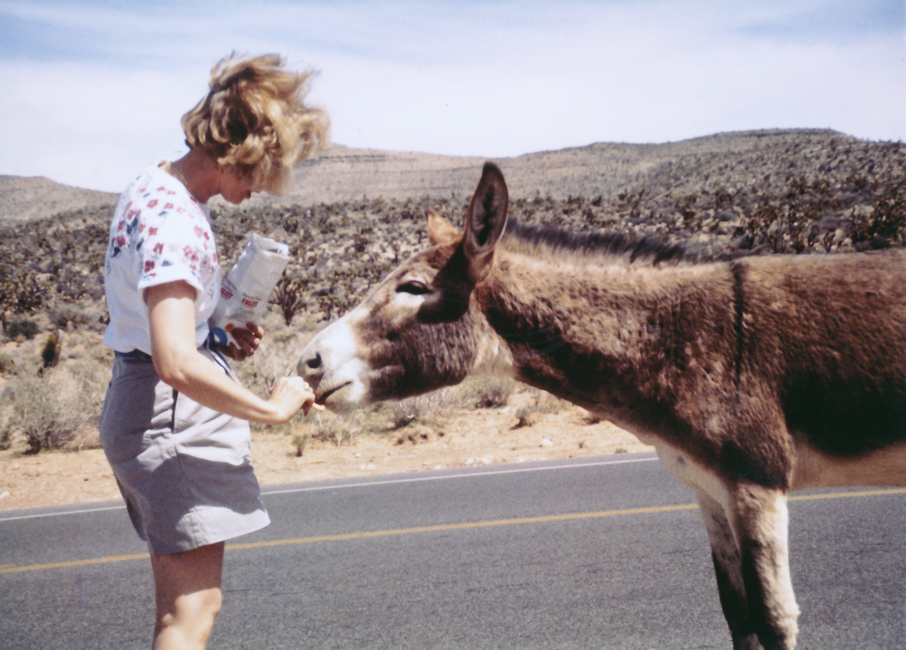 Beth Ray with a wild burro. Beth is on the left. Red Rock scenic area, outside Las Vegas, Clark Co., NV, ca. 1989.
