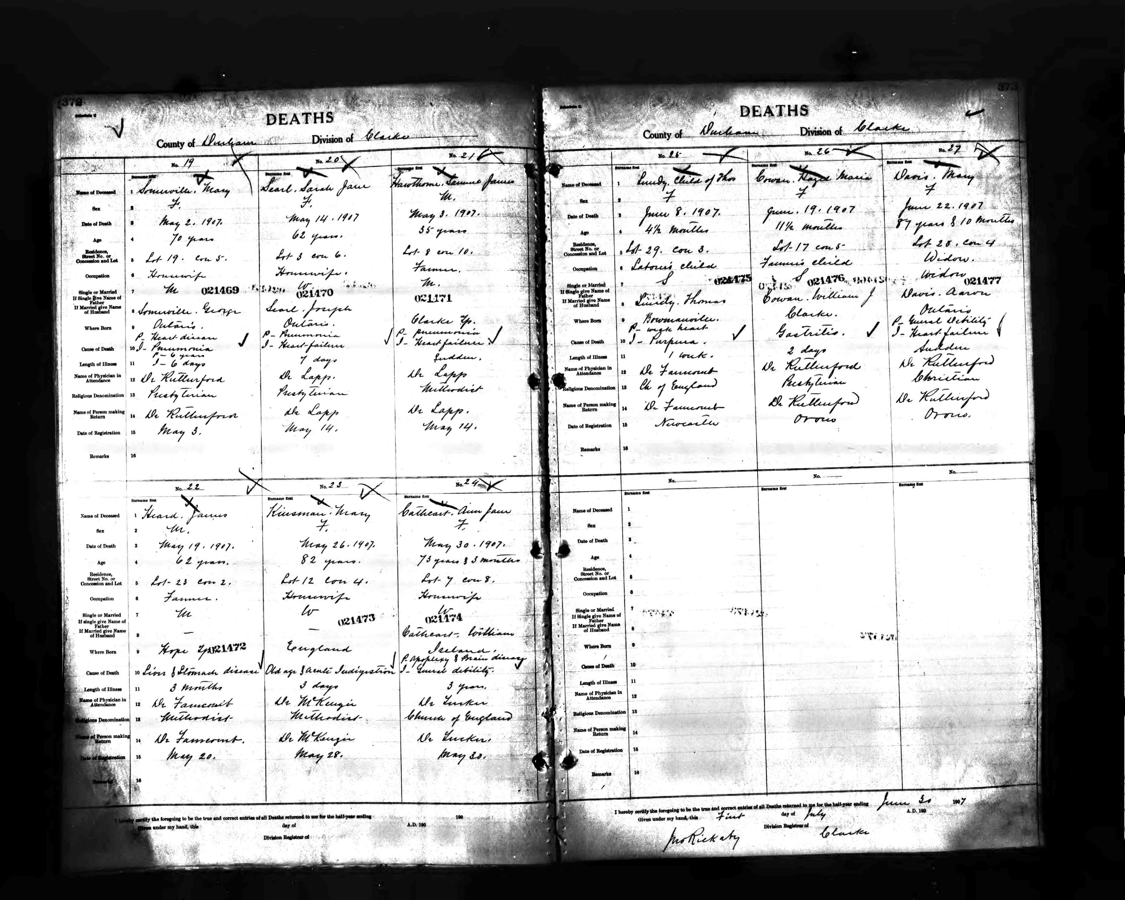 Sarah Jane (McCarthy/McGahey) Searl Death Listing, 1907 Hope Twp., Durham Co., Ontario, Canada.