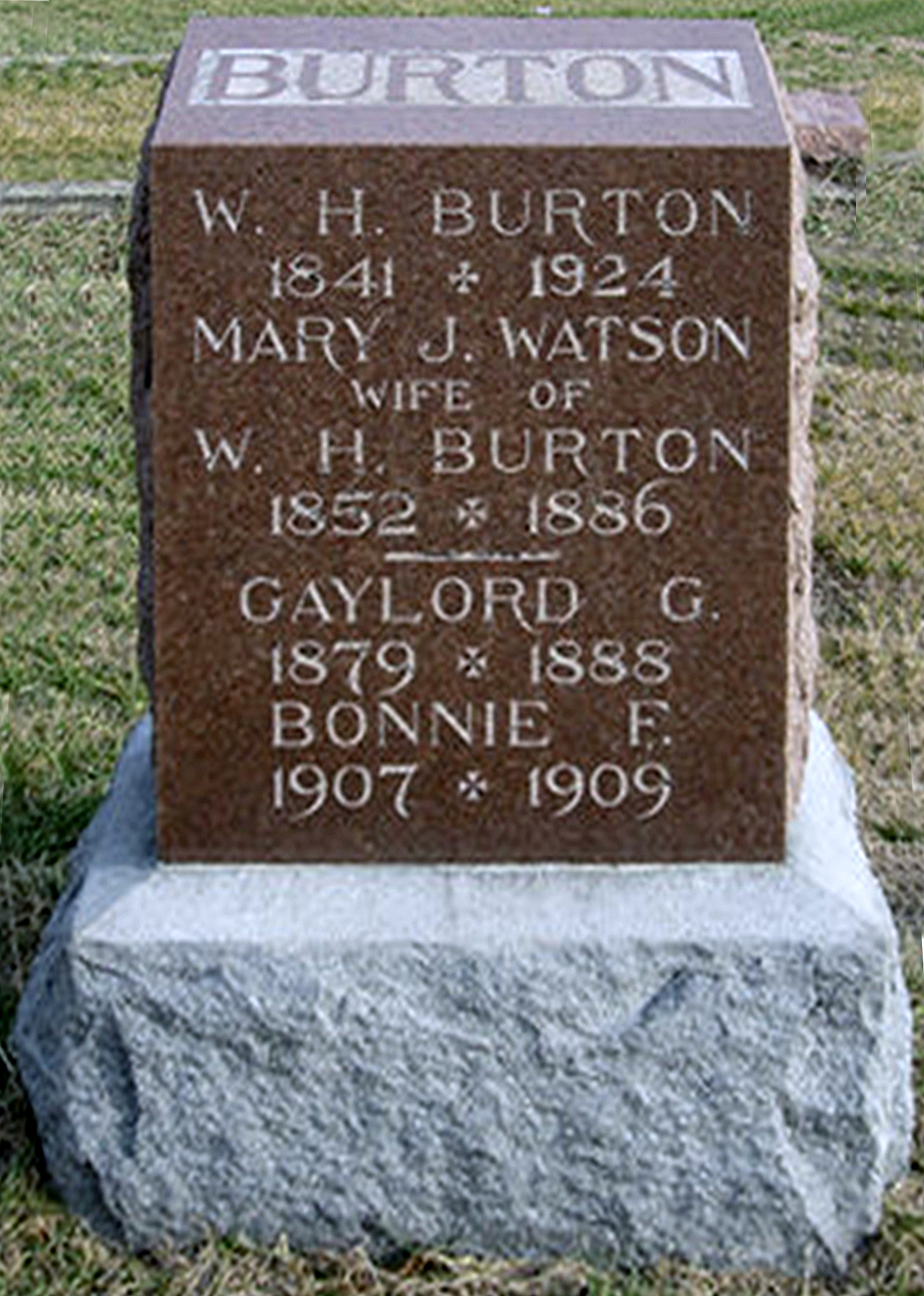 William Henry Burton, Mary Jane "Jennie" (Watson) Burton, and other Burton family members are buried in Lake Village Cemetery, Lake Village, Newton Co., IN. Thanks to Find-A-Grave for making this image available.