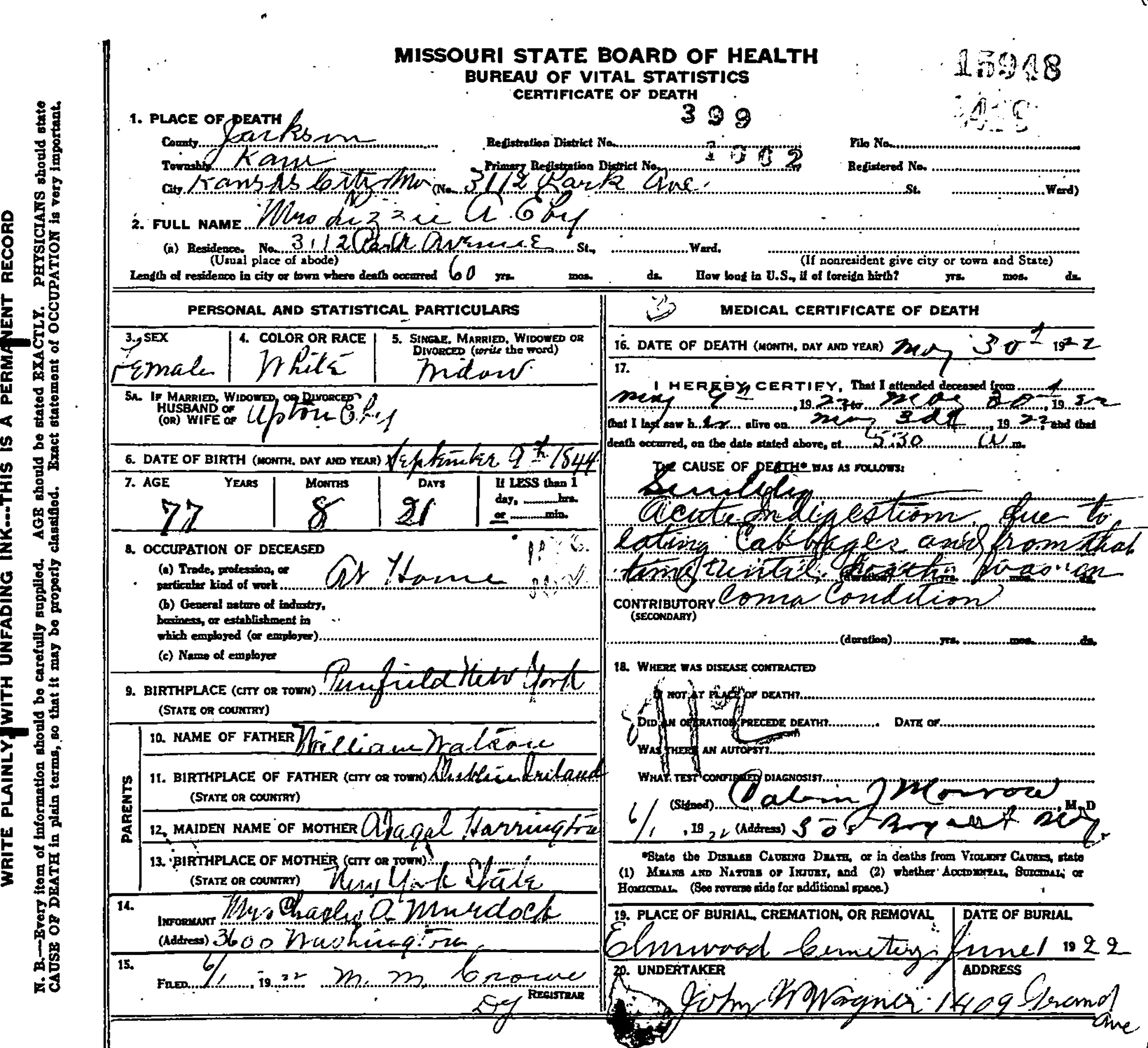 Elizabeth A. "Lizzie" (Watson) Eby died May 30, 1922, in Kansas City, Jackson Co., MO, at age 79. Buried in Elmwood Cemetery, Kansas City, Jackson Co., MO.