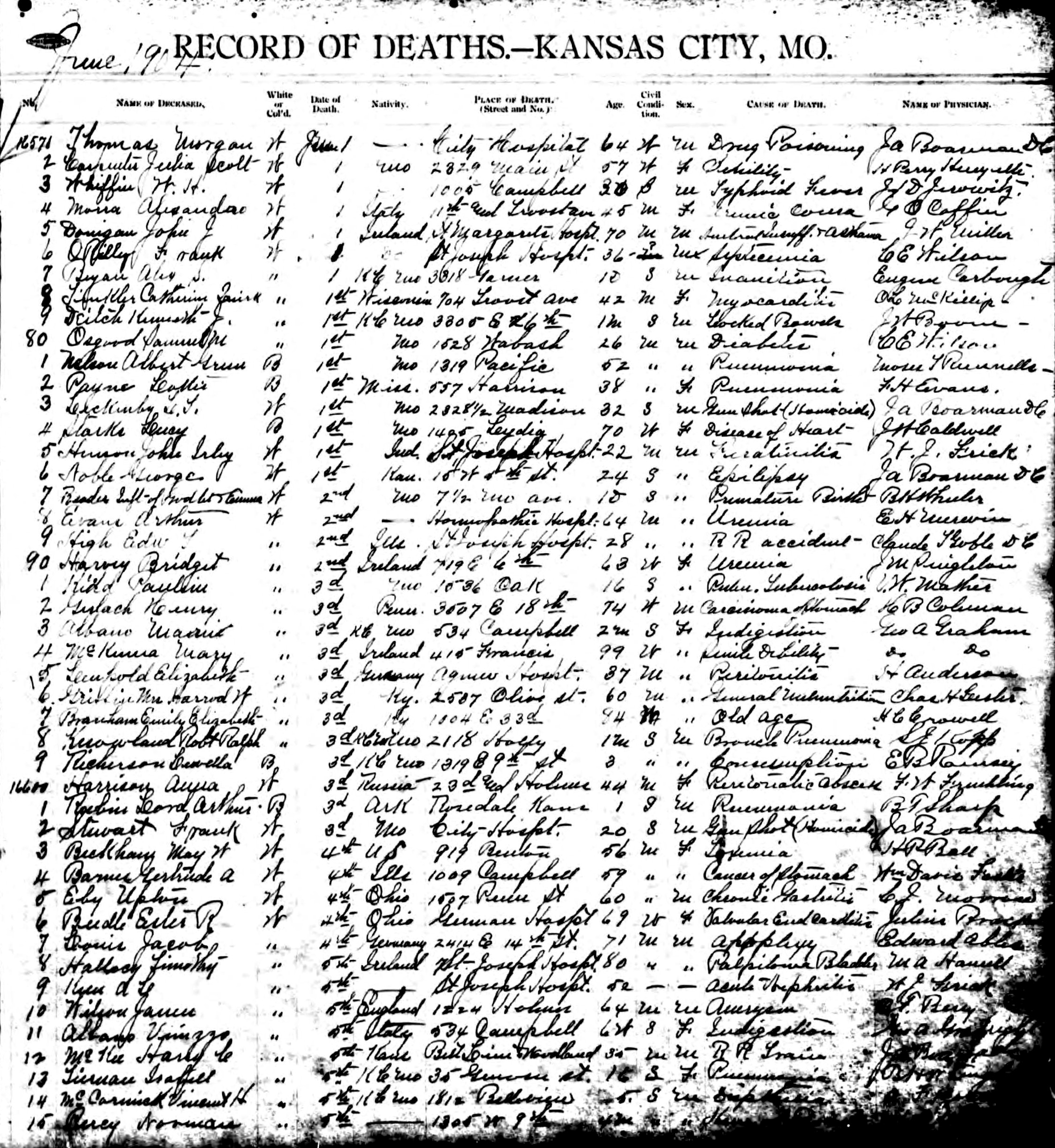 Upton Eby, formerly a wholesale grocer, pioneer resident of Kansas City, died unexpectedly yesterday afternoon at his home, 1507 Penn street. Although Mr. Eby had been ill for several weeks with stomach trouble and heart disease, his condition was not believed to be serious. Shortly after 2 o'clock yesterday afternoon, while on a sofa at his home, he fell dead to the floor. Mr. Eby was born in Mansfield, Mo., in 1844, and the same year his parents moved to Brookfield, Mo. In 1858, when 14 years of age, he came to Kansas City. After receiving his education at Fayette, Mo., he became a traveling salesman for the Gregory Wholesale Grocery company of this city. Later Mr. Eby organized the Riley-Eby Wholesale Grocery company, and remained with that firm until he retired ten years ago. Since that time he had been engaged in the stock and mercantile business in Indian territory. In 1865 he was married to Miss Lizzie Watson of Kankakee, Ill., who survives. He also left three children, who live in Kansas City. They are Mrs. C. J. Morrow, Mrs. C. A. Murdock and Frank W. Eby. The funeral will be held Monday afternoon at 3 o'clock from the home. The services will be conducted by the Rev. Dr. Talbot. Burial will be in Elmwood cemetery.