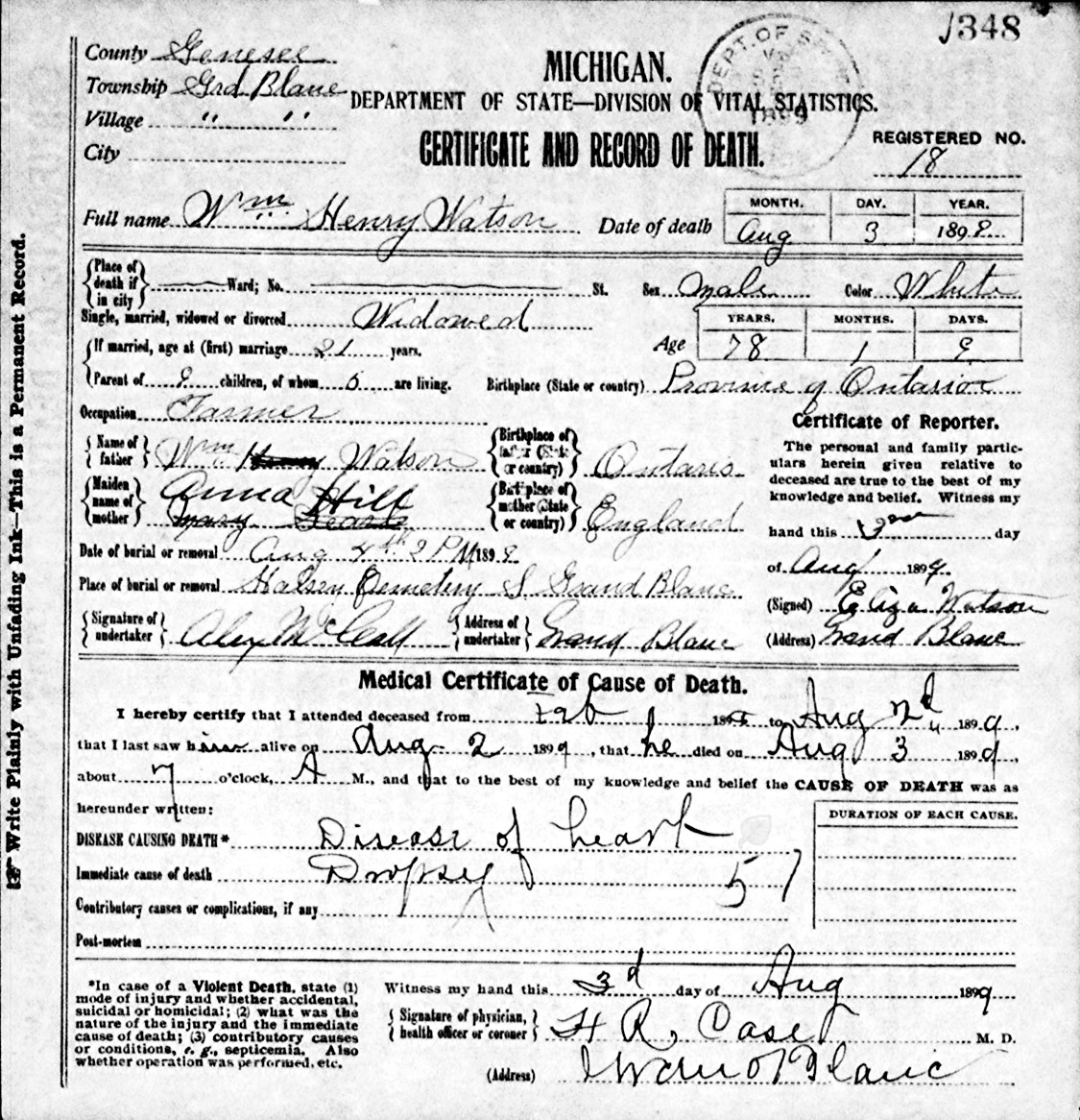 William Henry Watson Death Record. The cause of death was Heart Disease. He was born in Ontario, Canada. The named parents are incorrect.