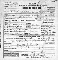 The 1910 U. S. Census dated May 2, 1910, shows Wyman Watson (age 31) born in English Canada to English Canadian-born parents and in his first marriage, and having immigrated in 1880 with Pa citizenship, is a married Blacksmith of his Own Shop who owns his home free of a mortgage and is living in Grand Blanc Twp., Genesee Co., MI. Living with him is his wife of 2 years, Lottie J. Watson (age 32) born in Michigan to Michigan-born parents and in her second marriage, with the only child born to her still alive. Also living there are: his daughter, Bernice M. Watson (age 11/12) born in Michigan to English Canadian and Michigan-born parents; and his unmarried mother, Eliza J. Watson (age 48) born in English Canada to English Canadian-born parents, and having immigrated in 1880.