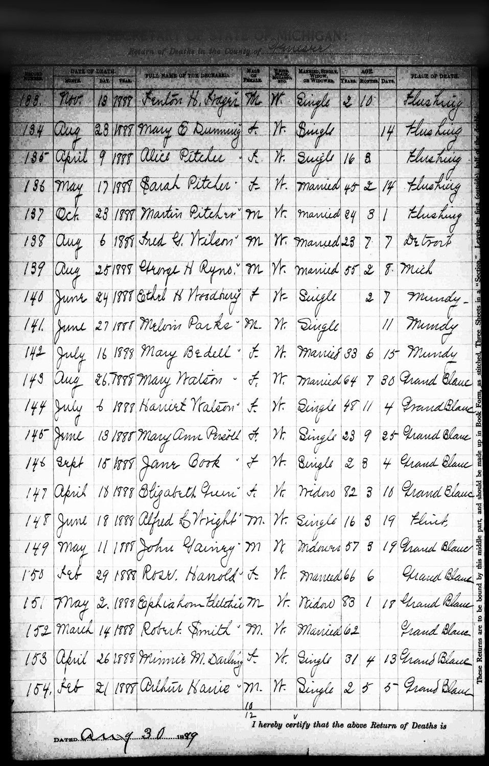 William Henry Watson died August 3, 1899, in Grand Blanc Twp., Genesee Co., MI, at about age 78. Buried in Halsey Cemetery, South Grand Blanc, Grand Blanc Co., MI.