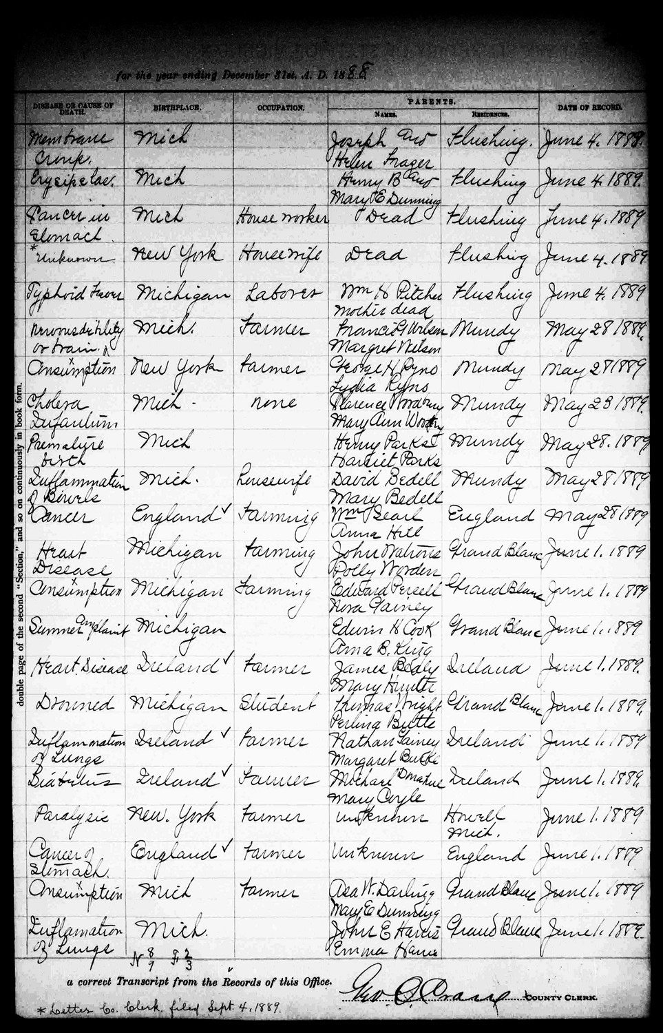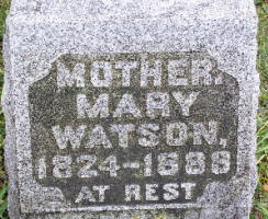 Mary (Searle) Watson died August 26, 1888, in Grand Blanc, Genesee Co., MI, at age 64 years, 7 months, and 30 days, according to the death certificate. Buried in Halsey Cemetery, South Grand Blanc, Grand Blanc Co., MI.