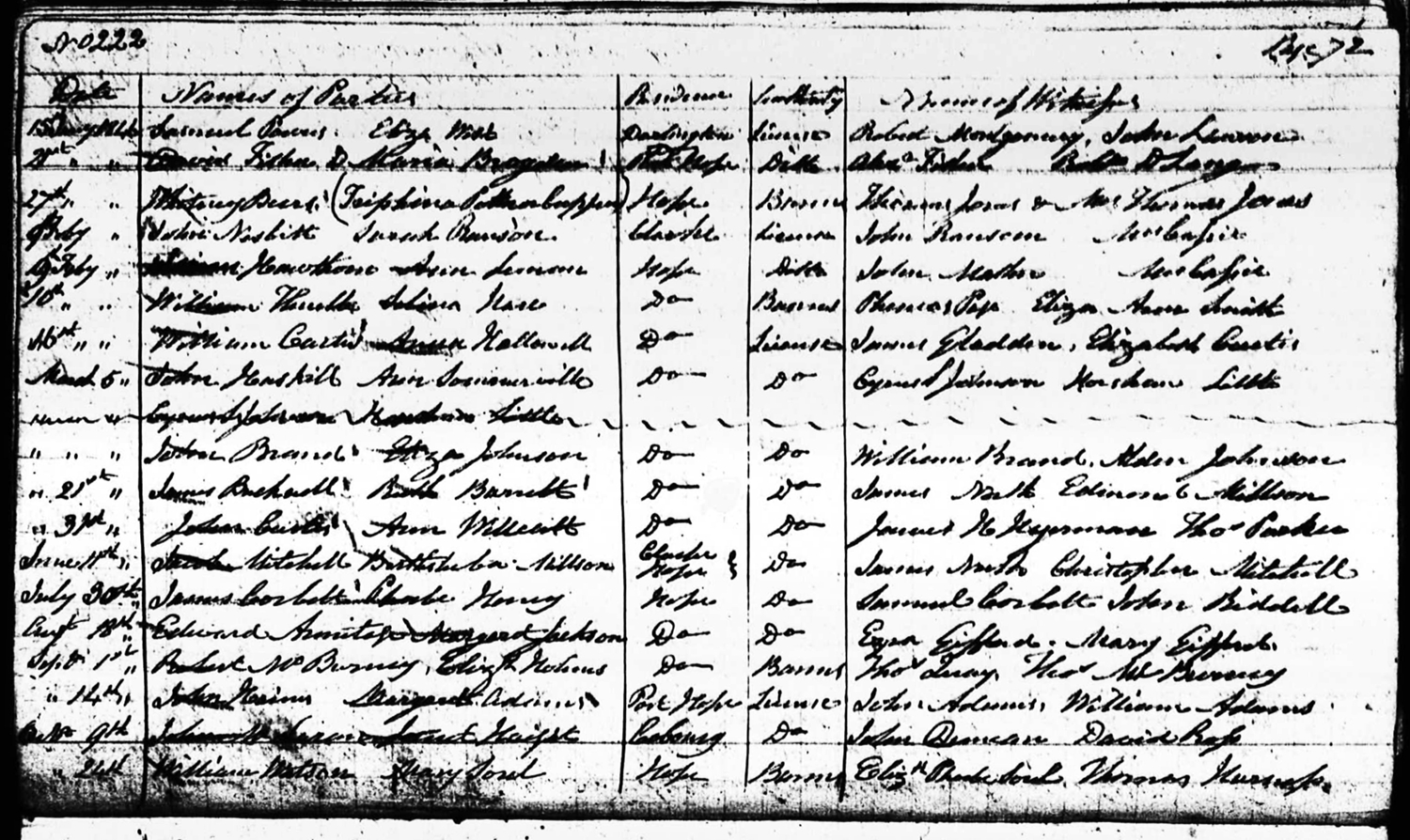 William Watson and Mary Searle were married October 24, 1846, in Hope Twp., Durham Co., Canada West, by Rev. John Cassie. "William WATSON, to Mary LORD or FORD (SOUL), both of Hope, 24 Oct. 1846. Rev. CASSIE. Wit. Elisabeth Phebe LORD or FORD (SOUL) and T'hos HARNESS". This is most likely Phoebe Elizabeth Searle, the sister of Mary Searle. When Phoebe got married, her sister Catherine Searle was a witness.